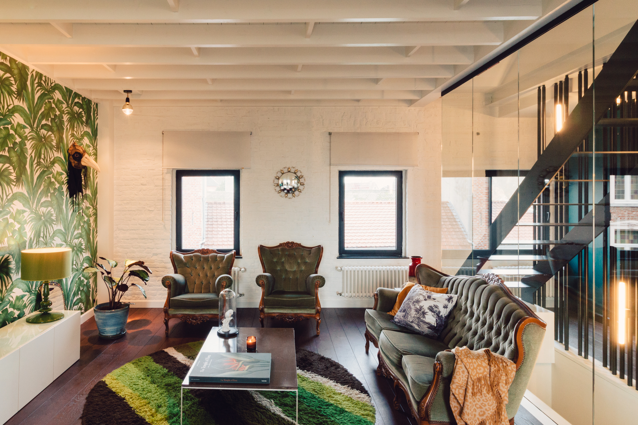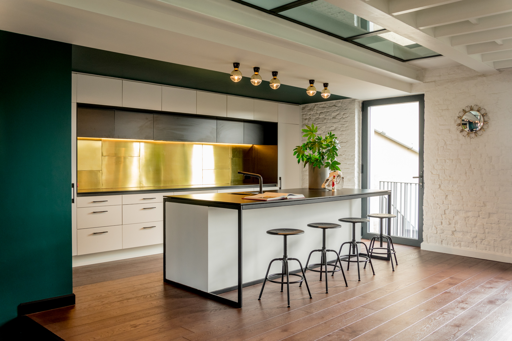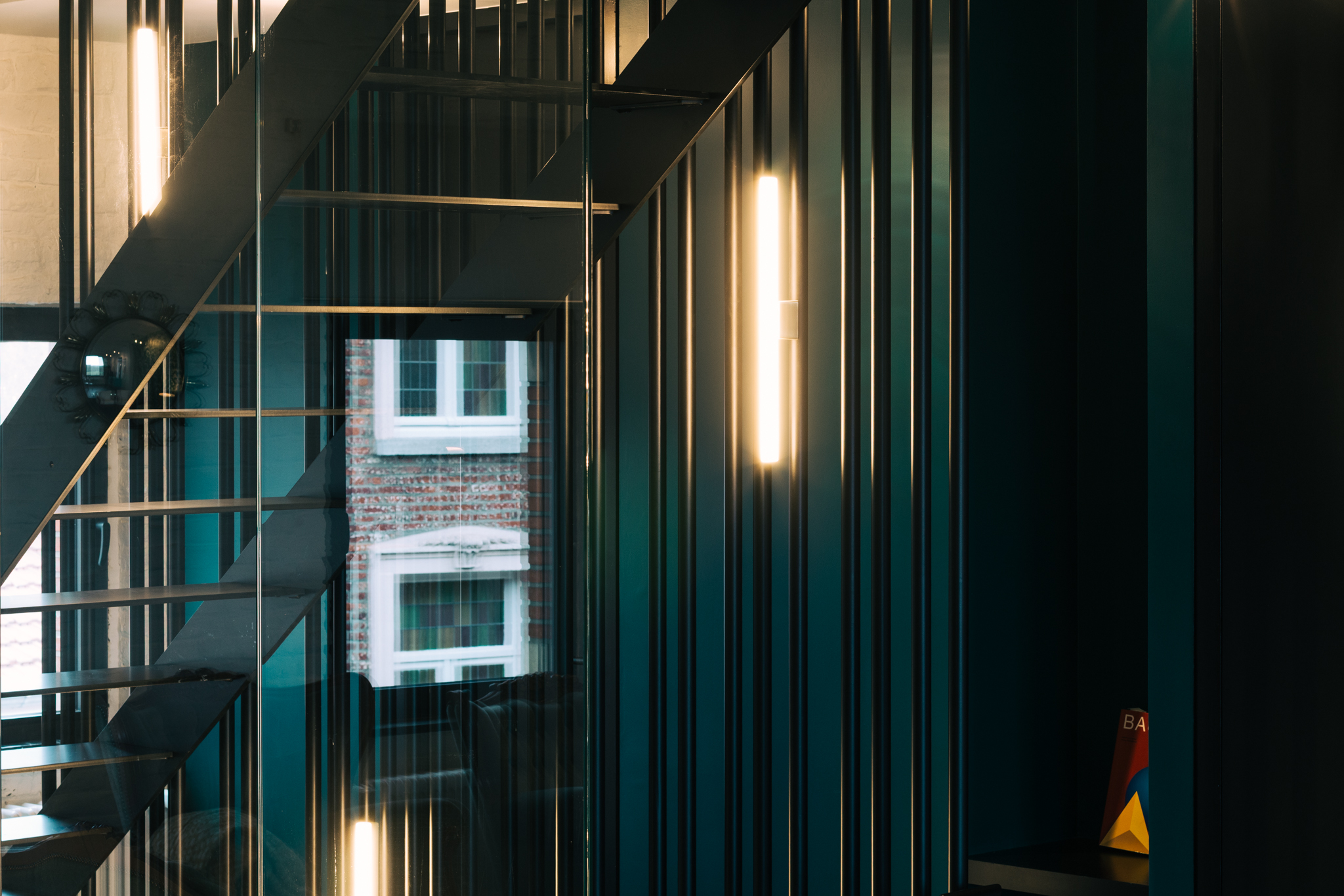 On the top floor, the apartment was expanded with the installation of a new floor. The original roof frame, which offered limited spatial potential, was replaced by a custom-designed metal structure. This striking triangular frame now features two prominent exposed steel beams, running without intermediate supports. These beams carry both the staircase and glass floor panels, infusing the space with natural light and a sense of airy openness.