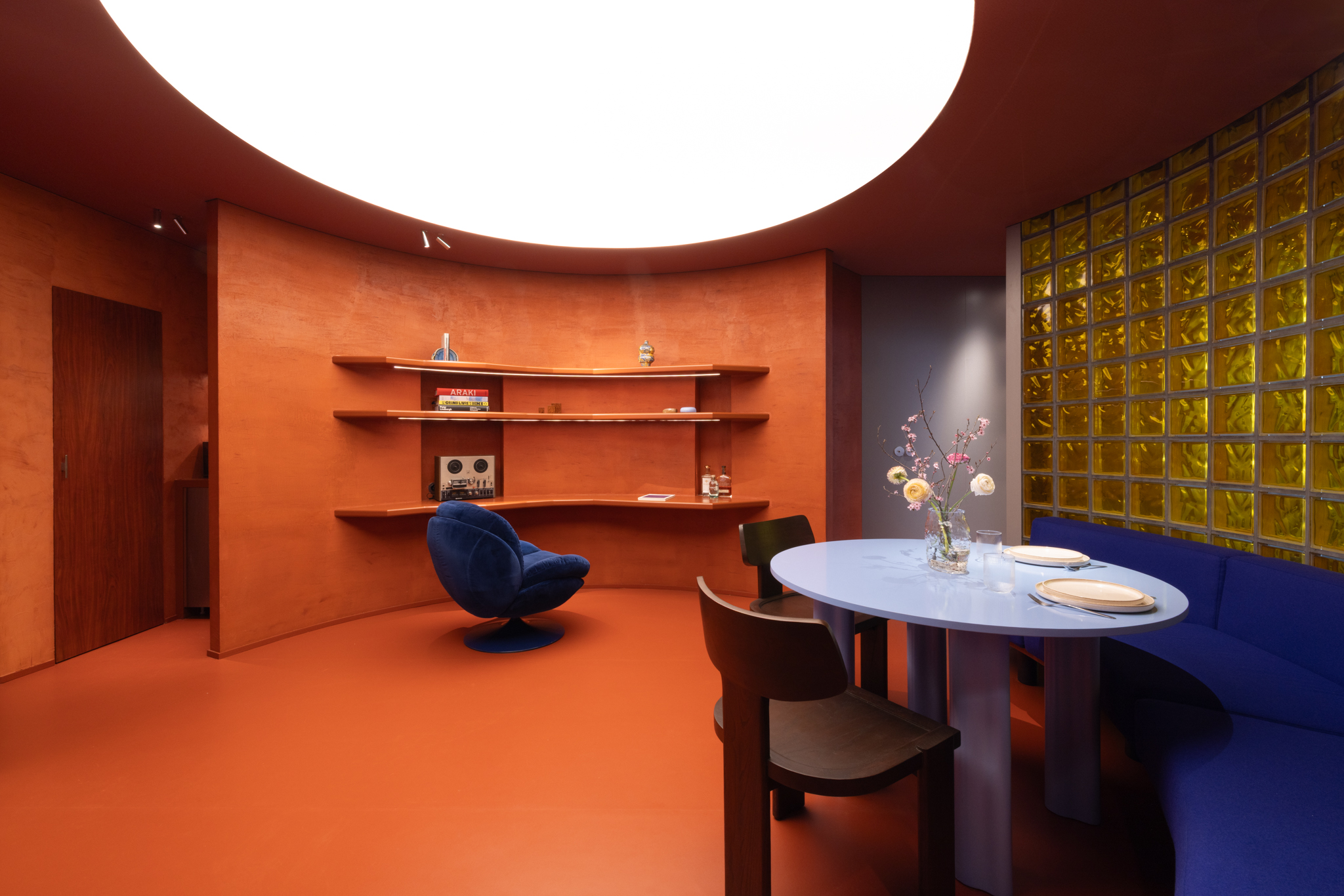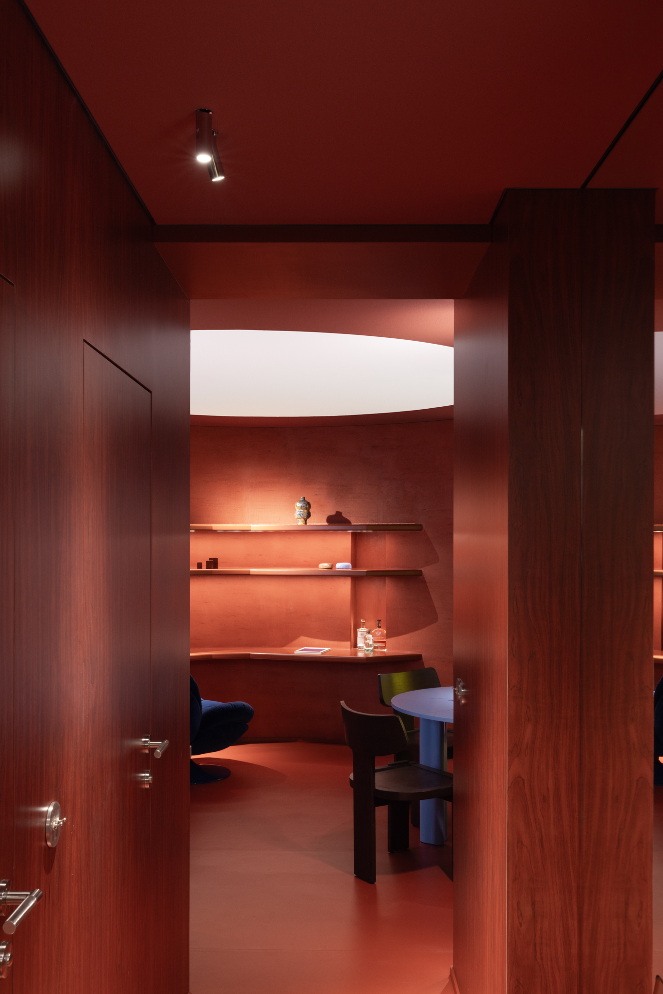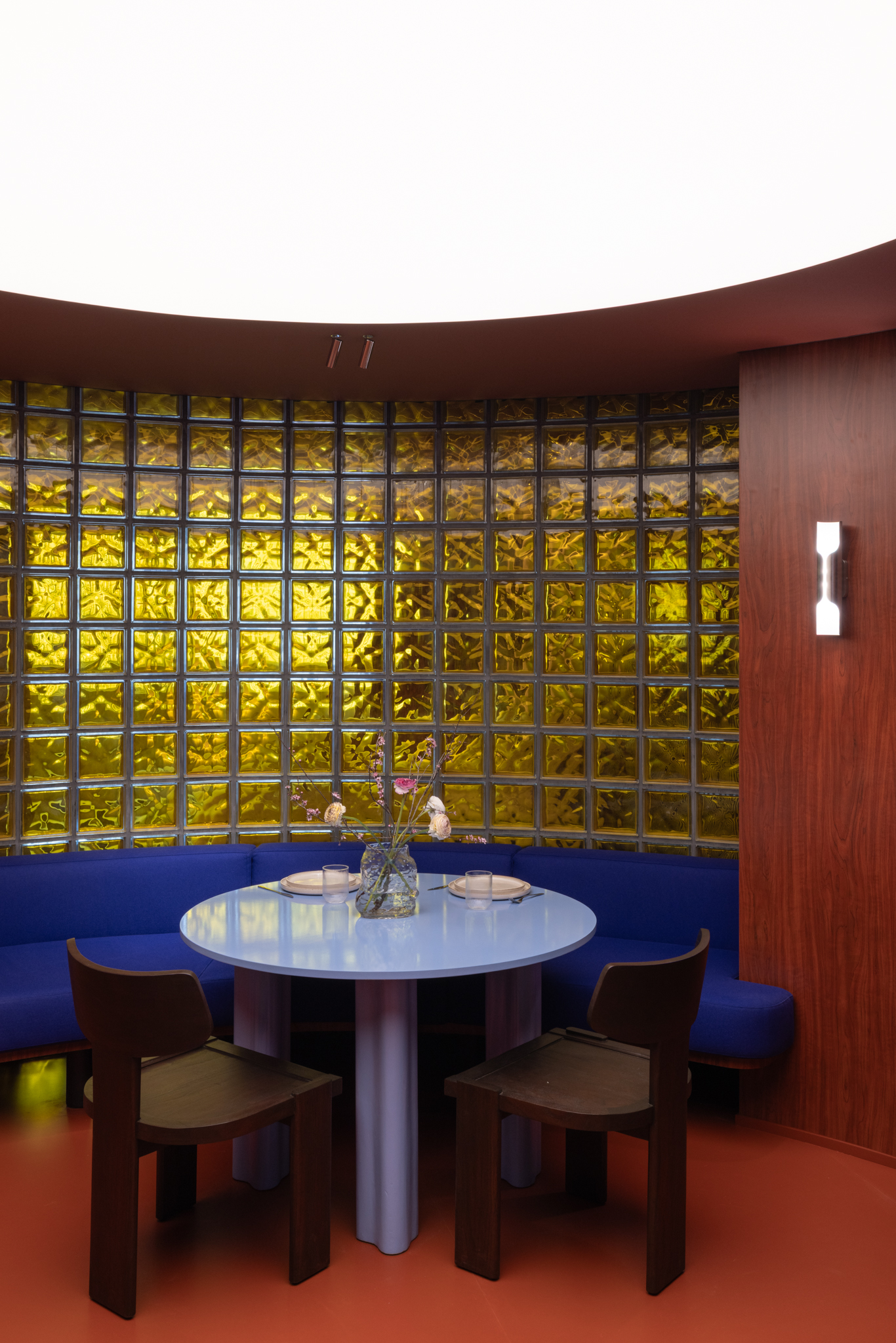 Materials such as wood veneer walls, stainless steel finishes, backlit circular ceilings, and yellow glass bricks have been meticulously chosen to offset the limited natural light. Embracing this constraint, the design opts for deep, rich hues and warm, tactile materials to create an inviting, immersive environment.
