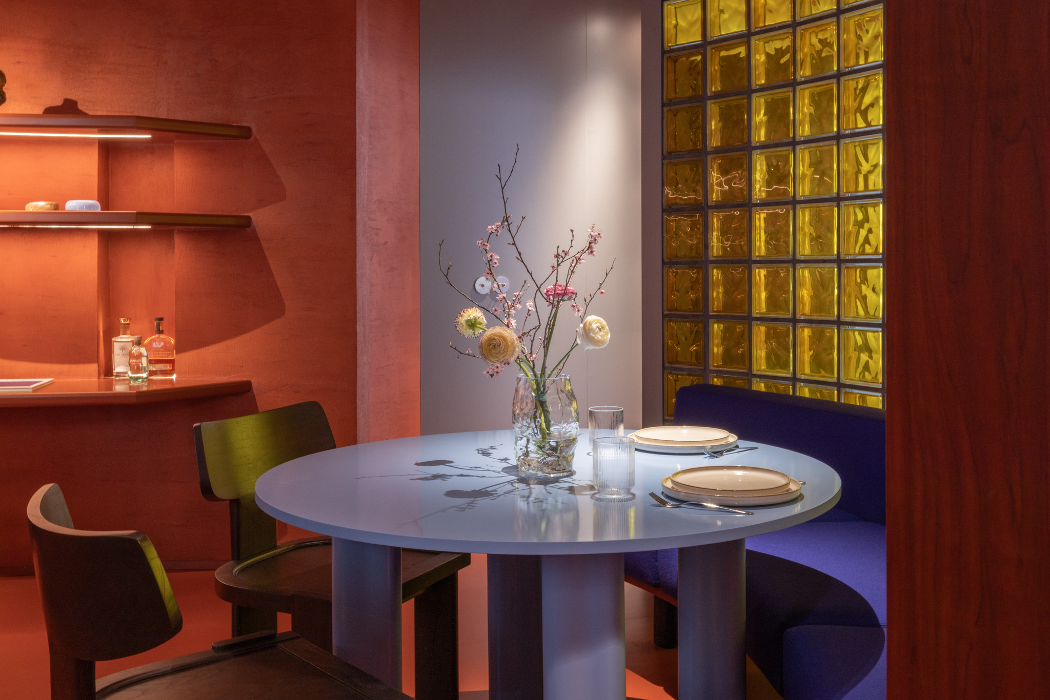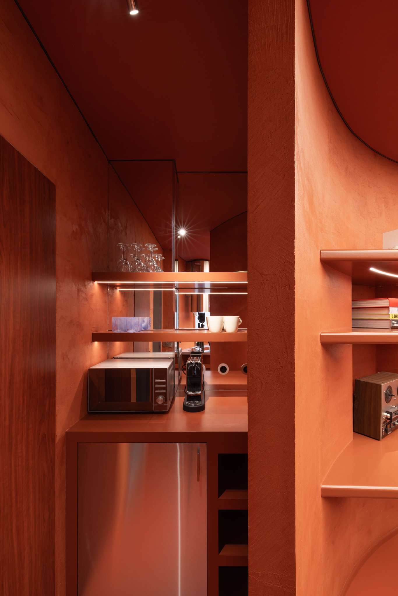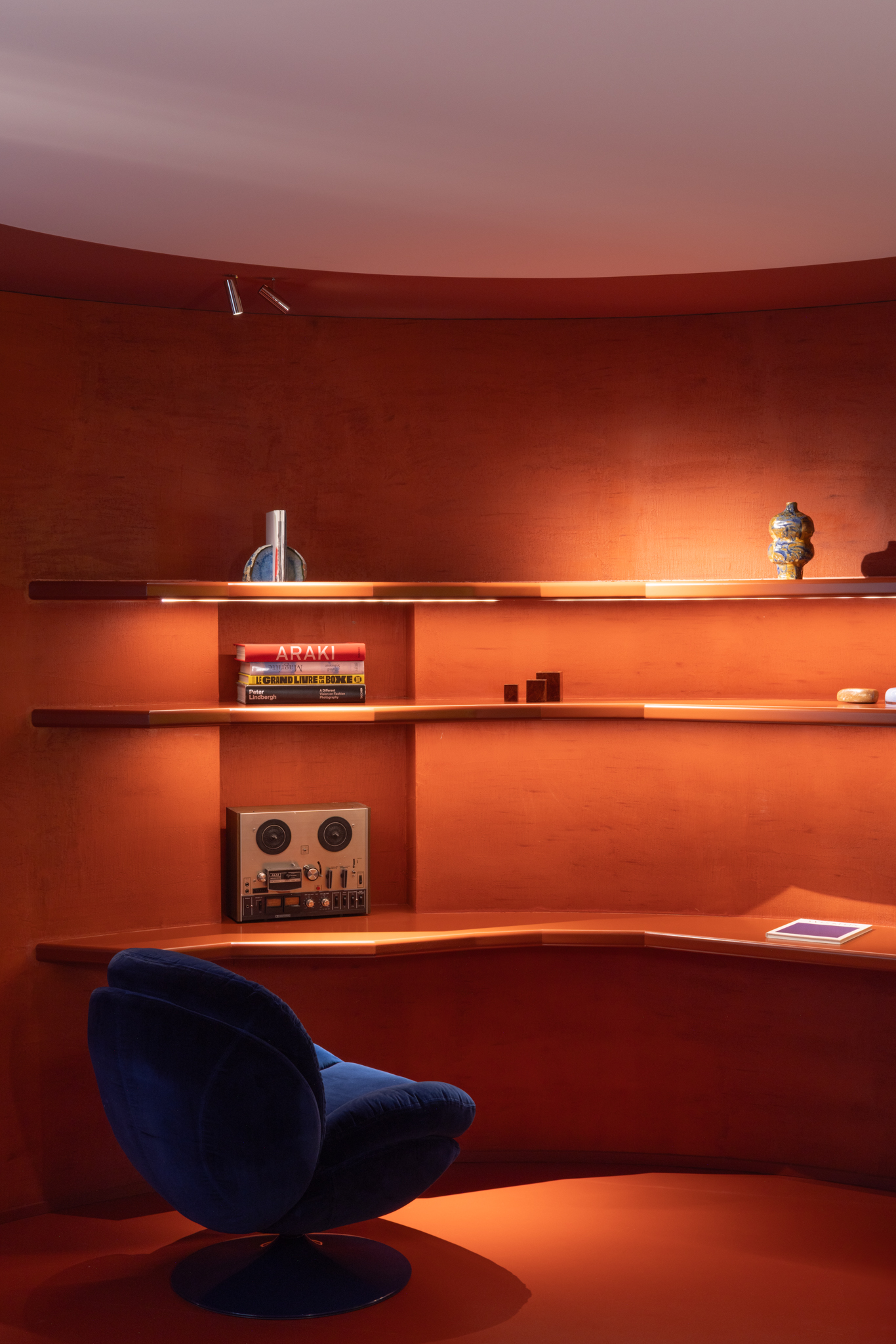 Materials such as wood veneer walls, stainless steel finishes, backlit circular ceilings, and yellow glass bricks have been meticulously chosen to offset the limited natural light. Embracing this constraint, the design opts for deep, rich hues and warm, tactile materials to create an inviting, immersive environment.