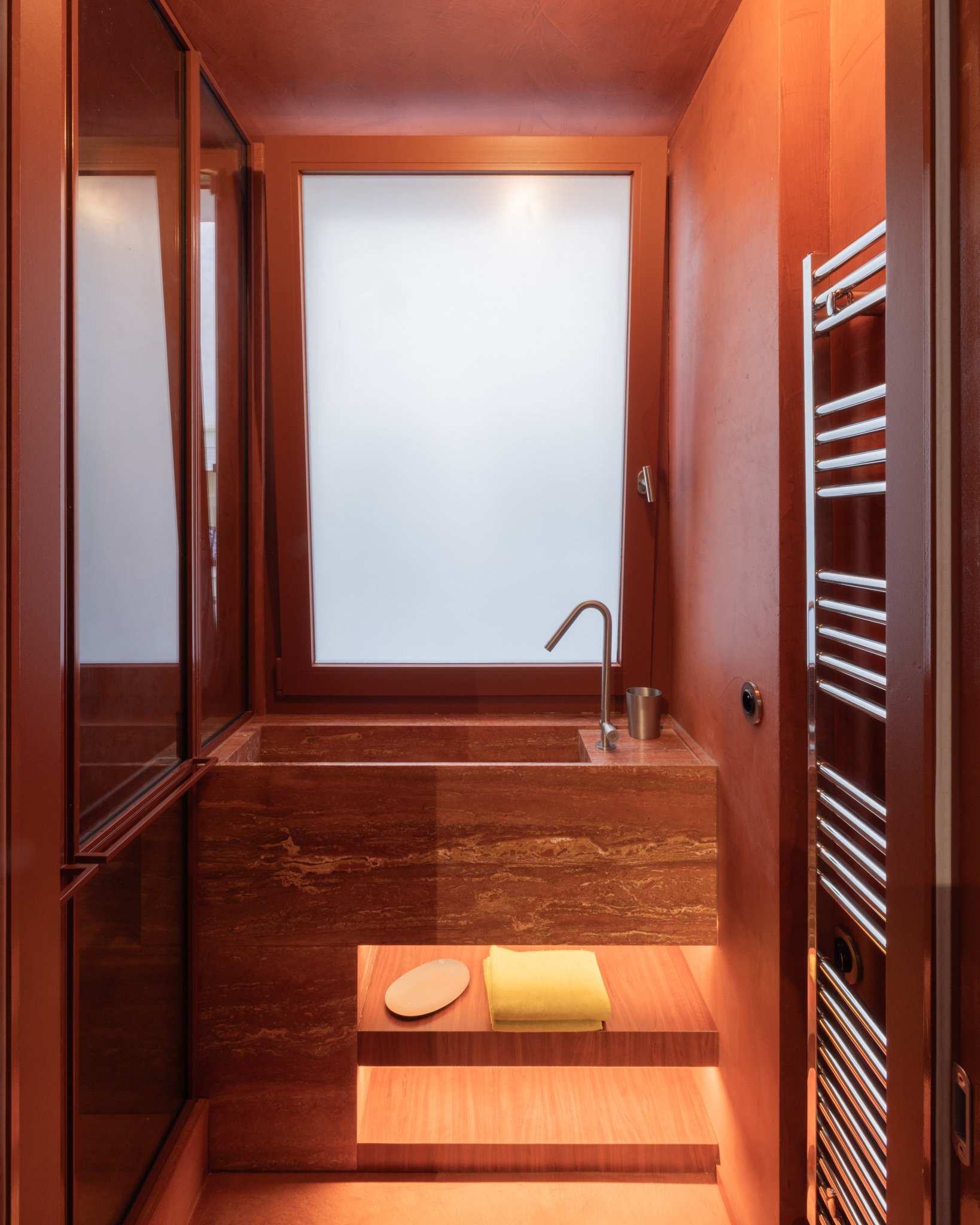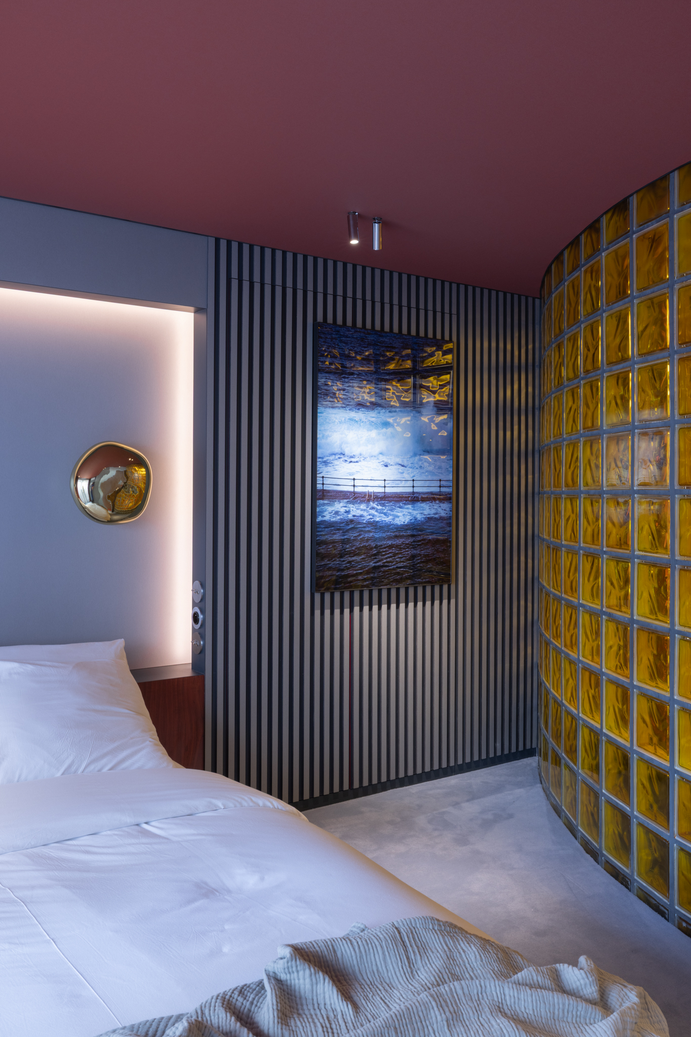 Glass bricks play a pivotal role, allowing light to filter into the apartment’s core. This creates a mesmerizing interplay of shadows and reflections, distorting reality and casting a soft, golden glow throughout the interiors.
