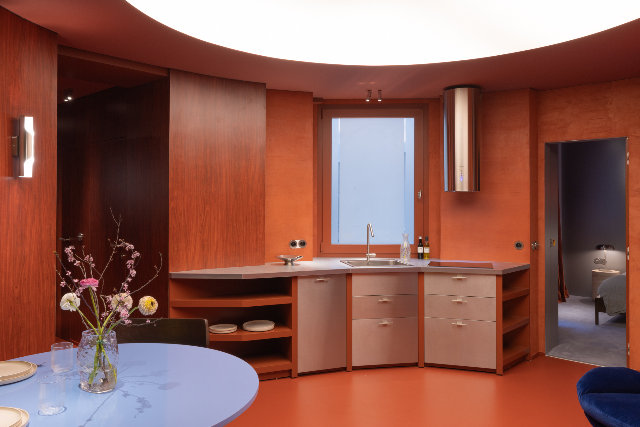 “'Color is embraced with bold confidence, blending cool and warm tones. From light blues to deep reds, with gradations of mauve and lavender, the palette is reminiscent of the dreamlike landscapes of the Canary Islands, infusing the apartment with a unique and transportive energy.'”Maxime De Campenaere