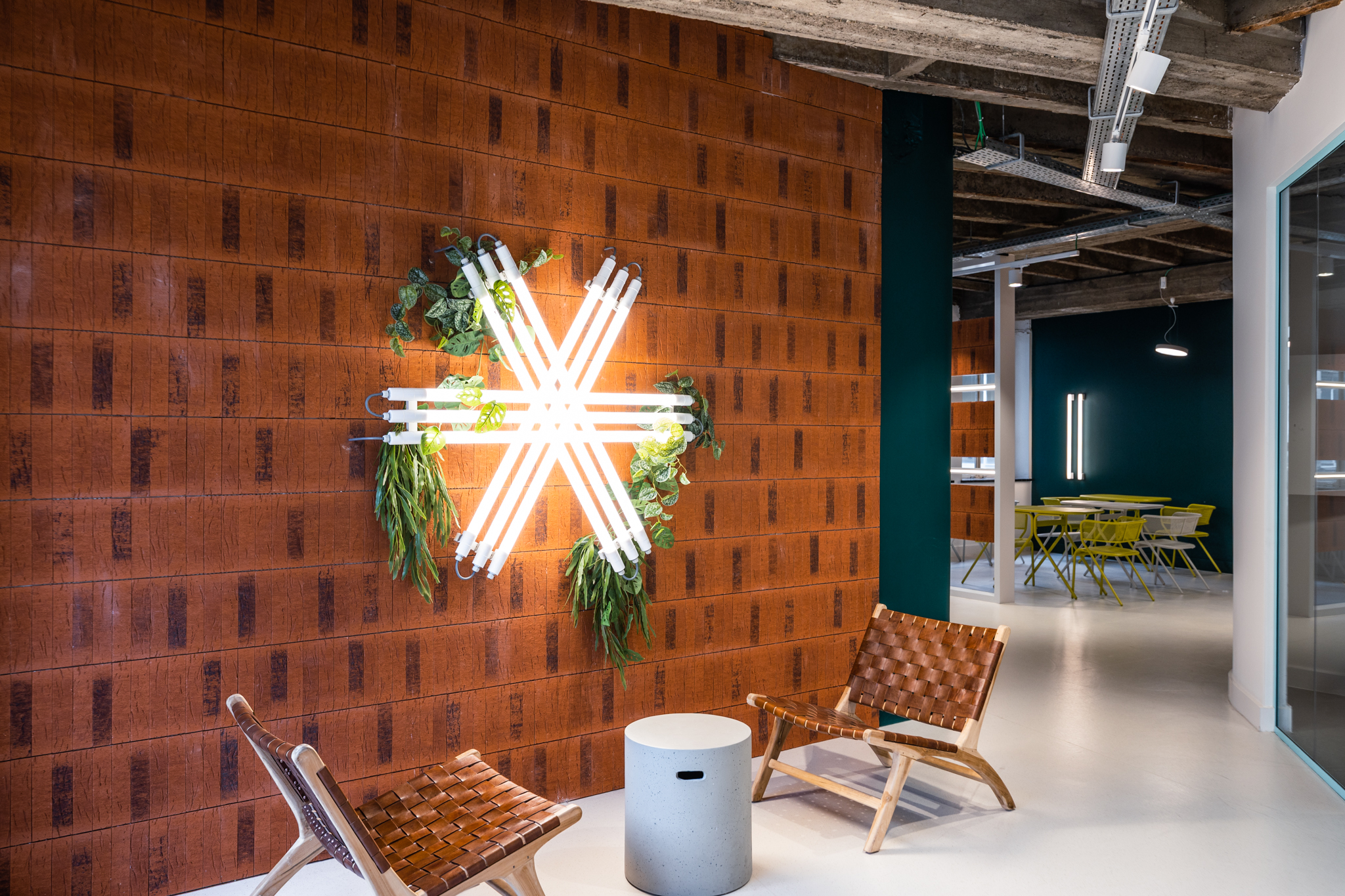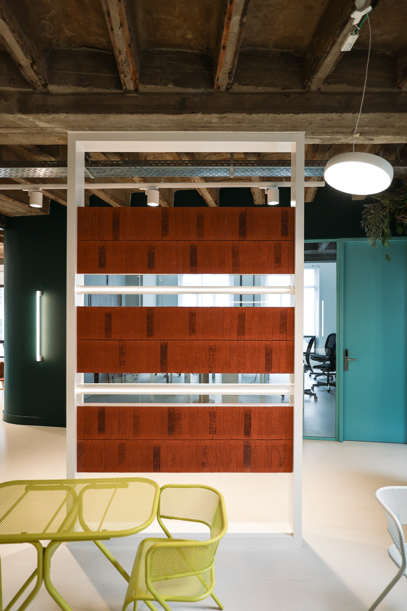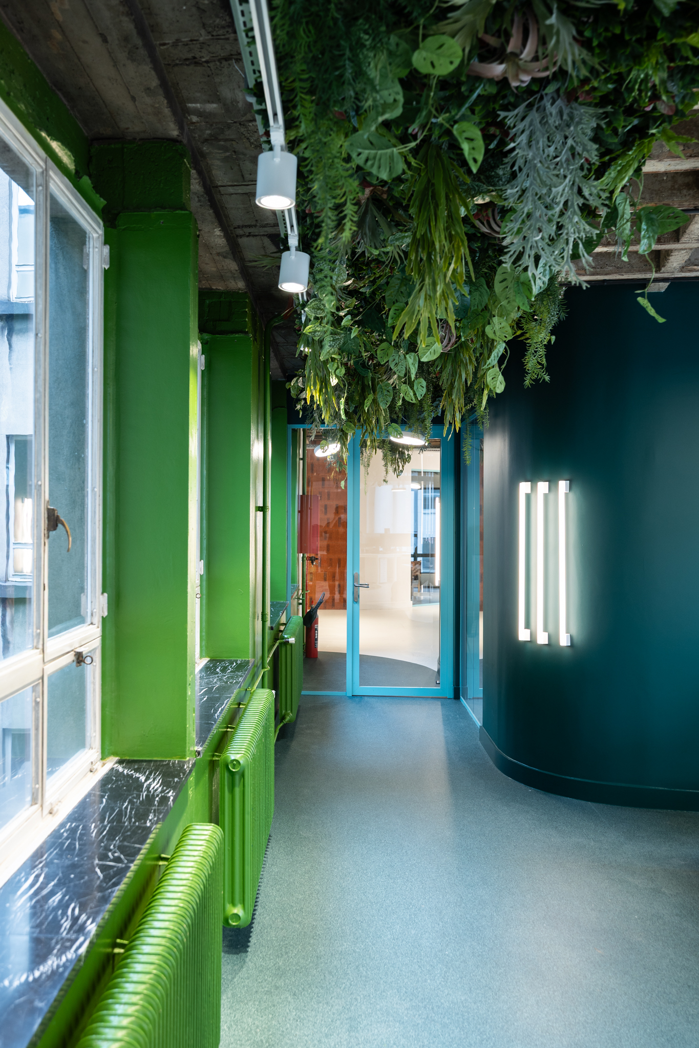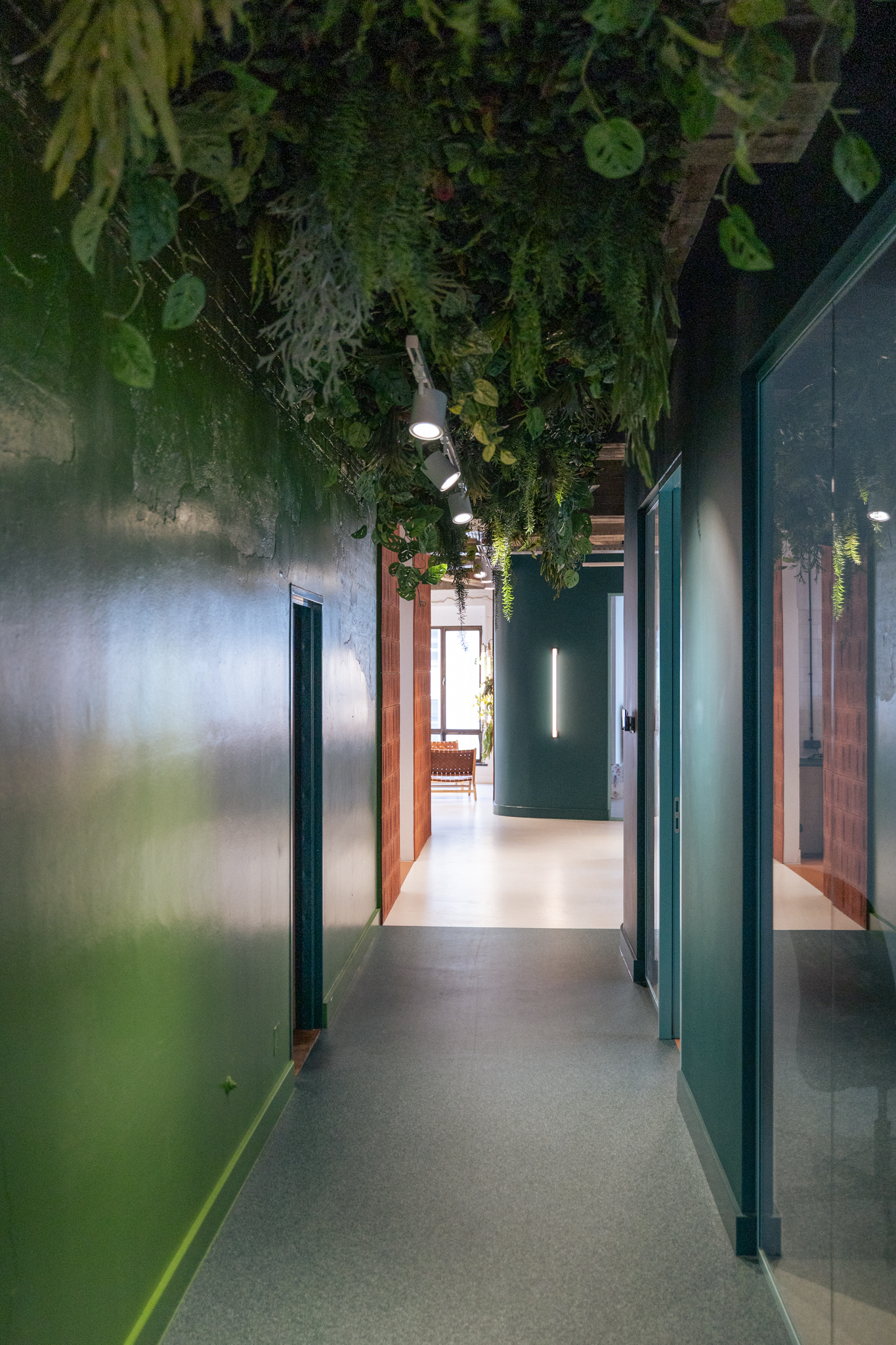 Deep green walls, lush planted ceilings, and turquoise glass partitions contrast harmoniously with terracotta brickwork, bringing warmth and character to the space. The meticulous selection of materials and colors highlights the studio’s expertise in interior design, specializing in crafting inspiring and functional coworking environments.