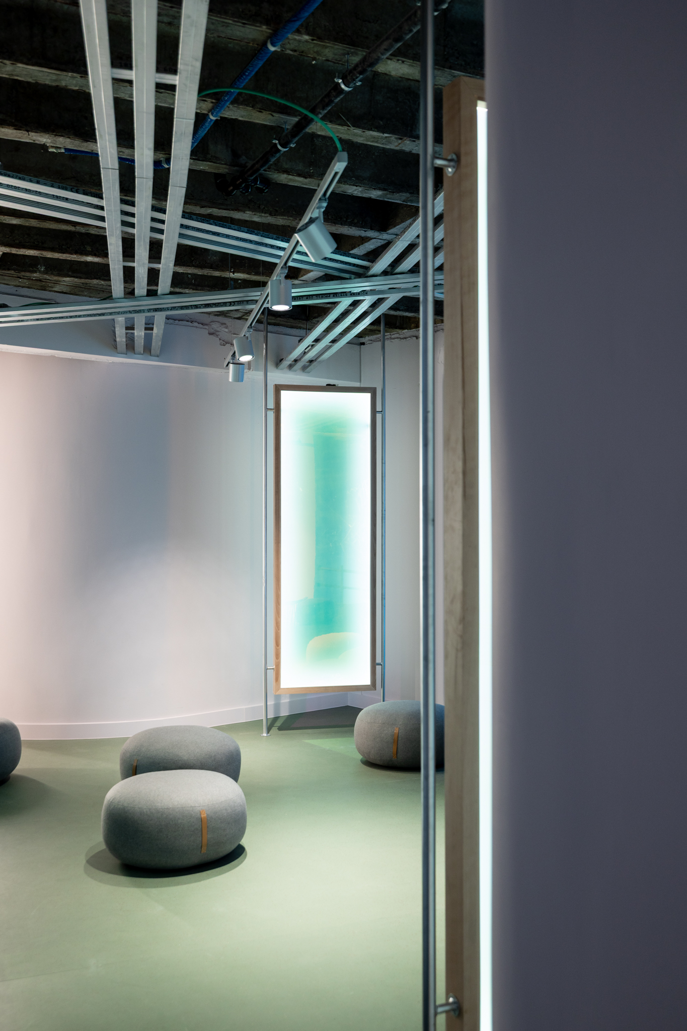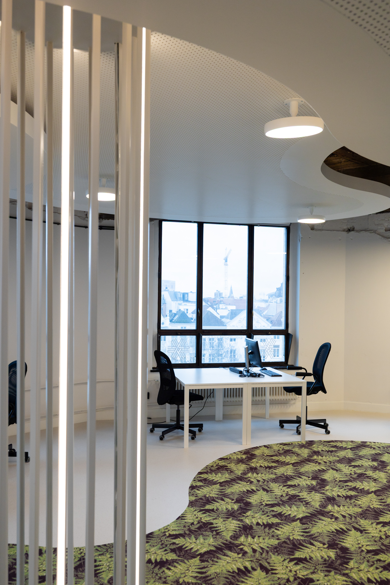 The interior layout features flowing, curved lines that respect the building’s original architecture. This design choice creates a seamless transition between workspaces, evoking the sense of moving through a calming, nature-inspired environment. At the core of the coworking space is an impressive acoustic canopy made of three monumental leaf structures, providing both sound comfort and an immersive atmosphere.