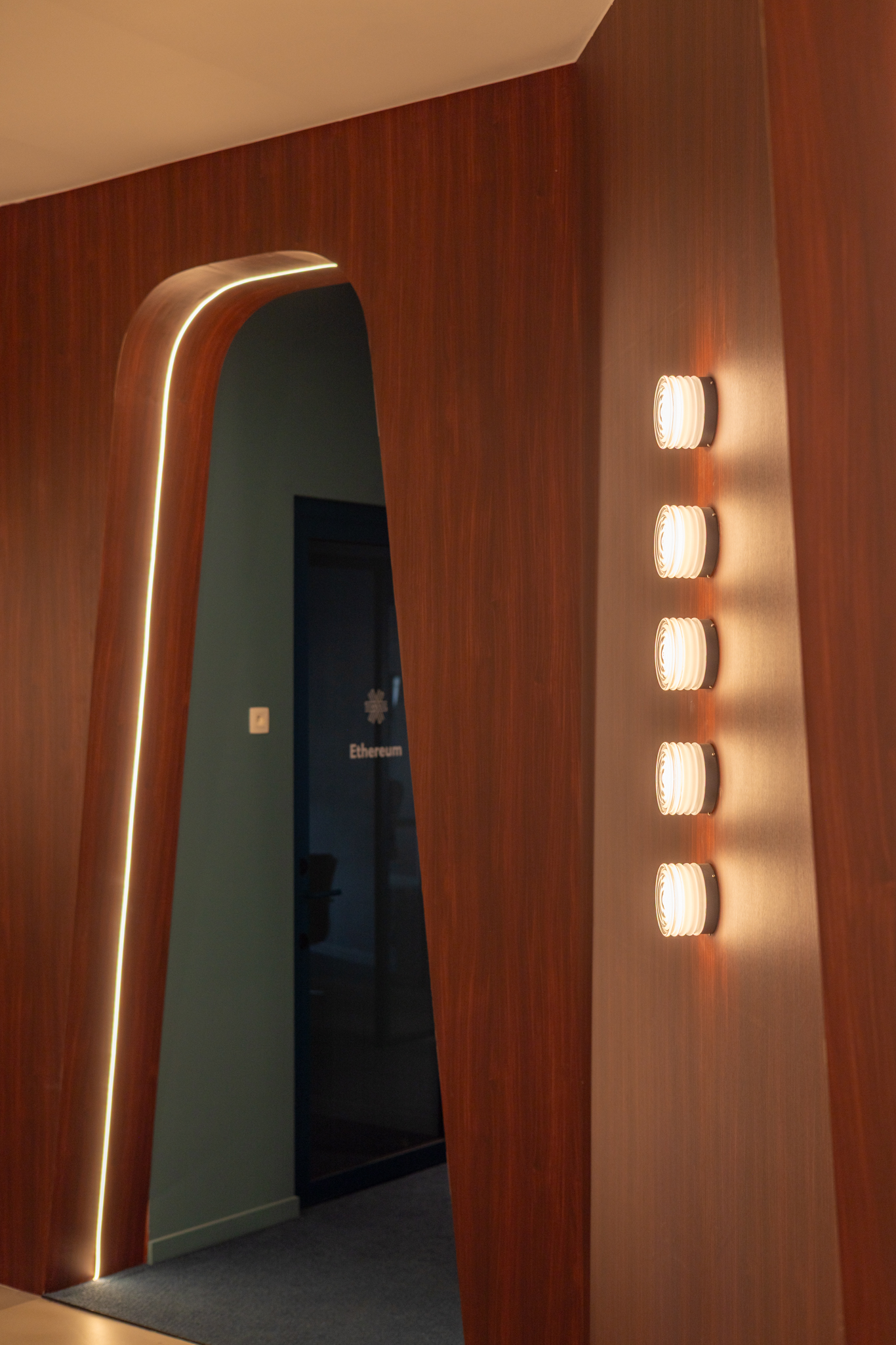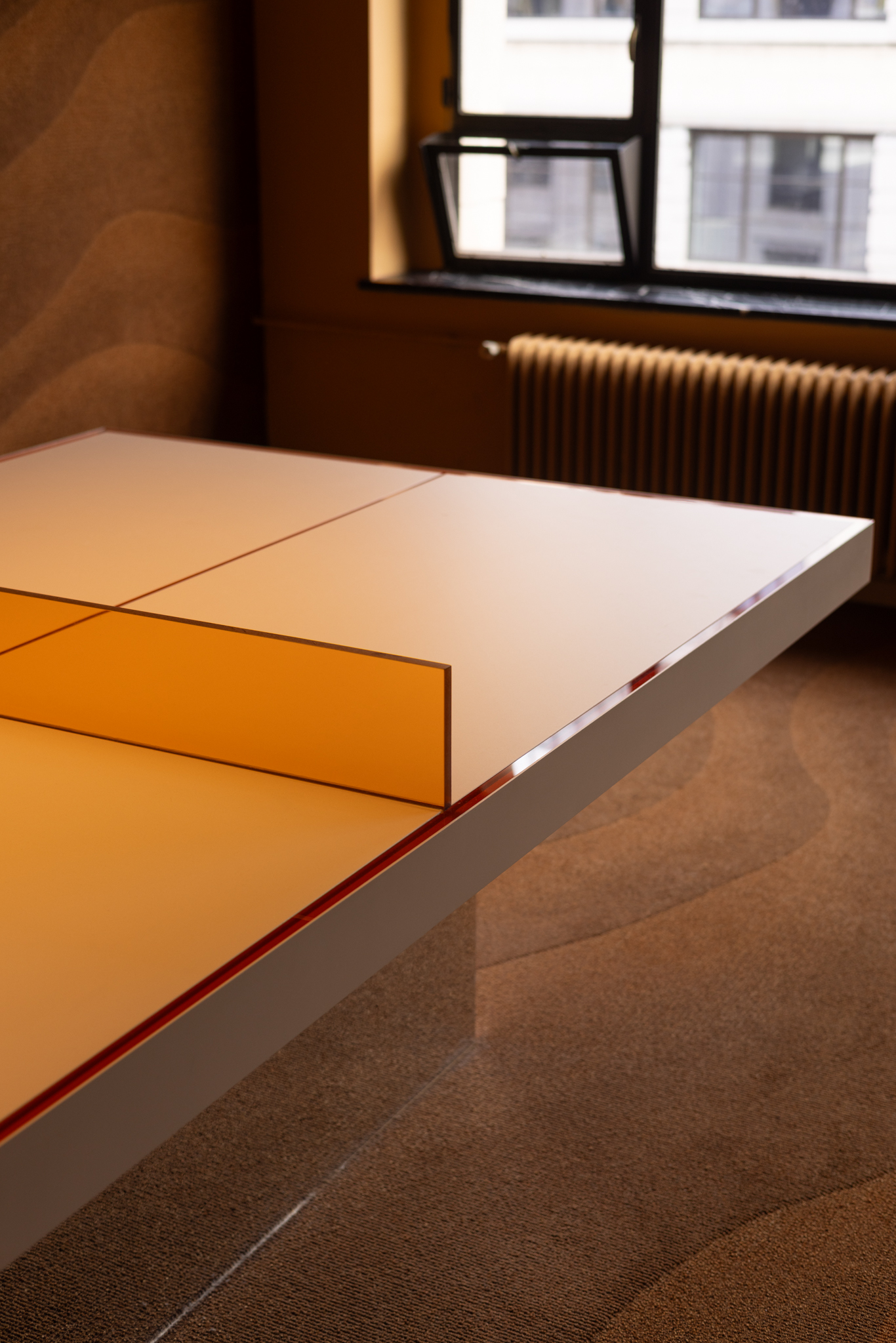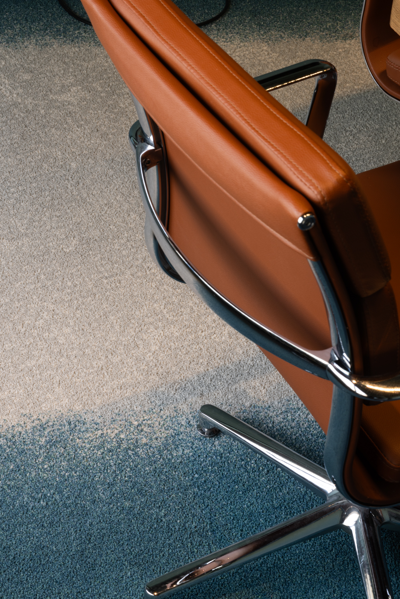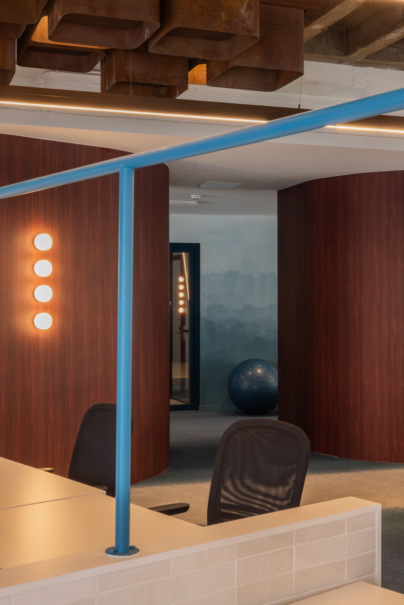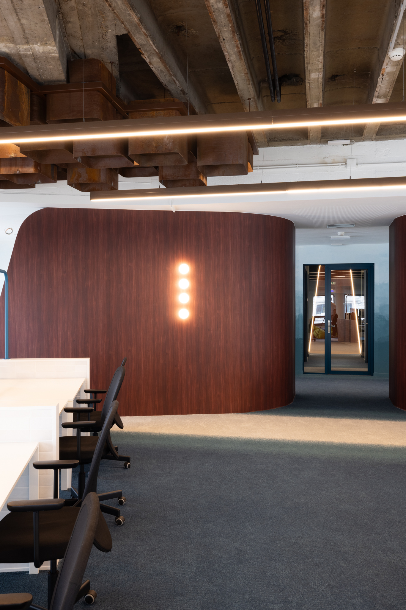 L’aménagement favorise une dynamique collaborative où les zones de travail calmes alternent avec des espaces ouverts propices aux échanges. Dans la zone de coworking, le sol est recouvert d’une moquette sur mesure qui, par ses nuances de bleu-vert, imite le mouvement des vagues. Certains espaces détente arborent des motifs d’ondulations rappelant le sable. Au plafond, les éléments récupérés auprès de RotorDC sont détournés en luminaires géants, apportant une sensation de grandeur et de profondeur. L’utilisation d’acier Corten fait écho à la terre et à l’oxydation naturelle des matériaux.