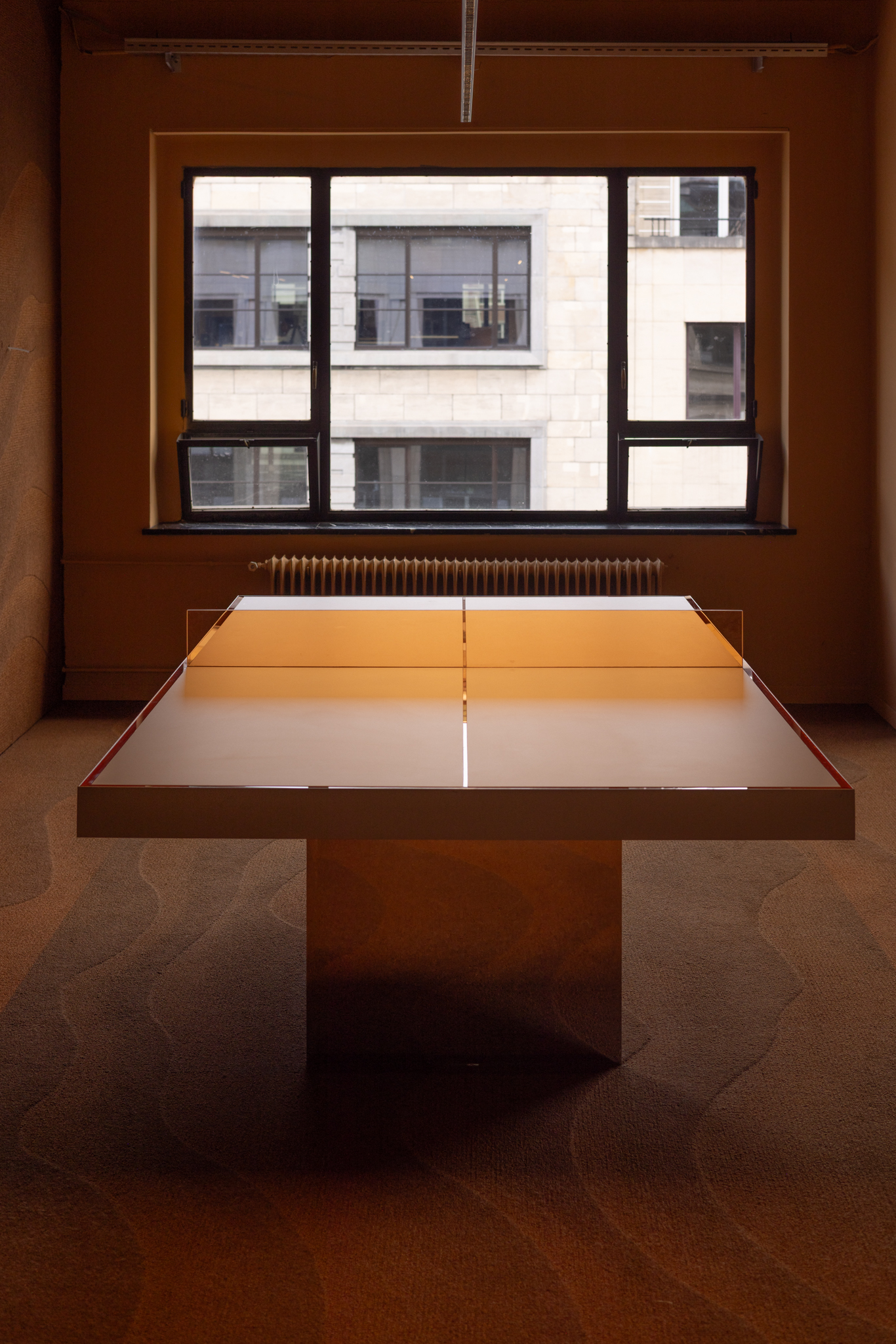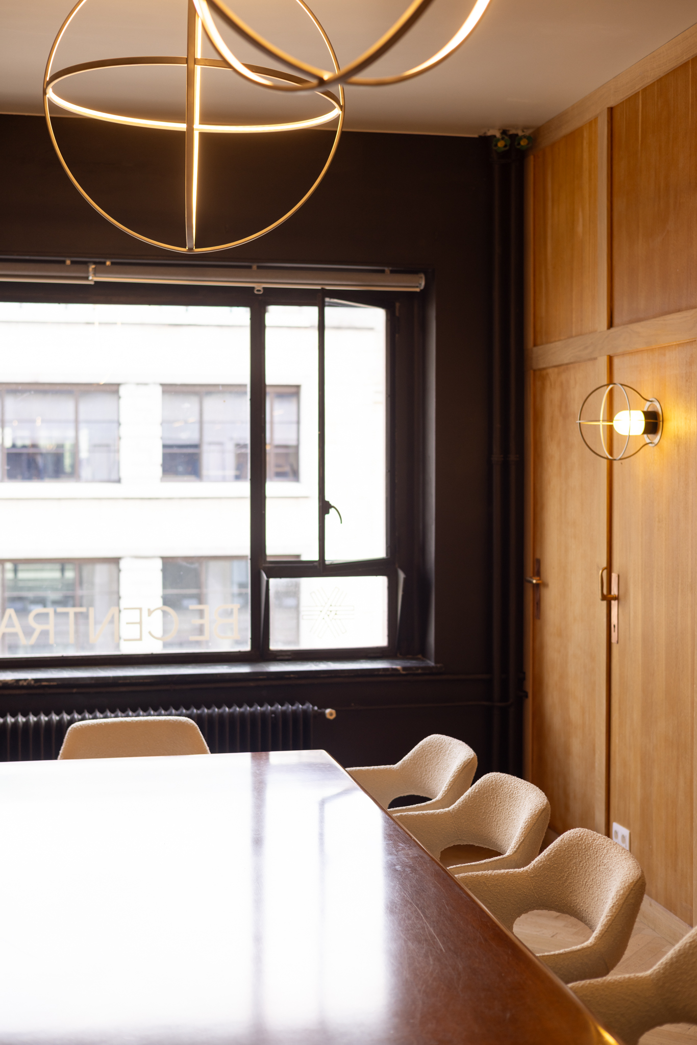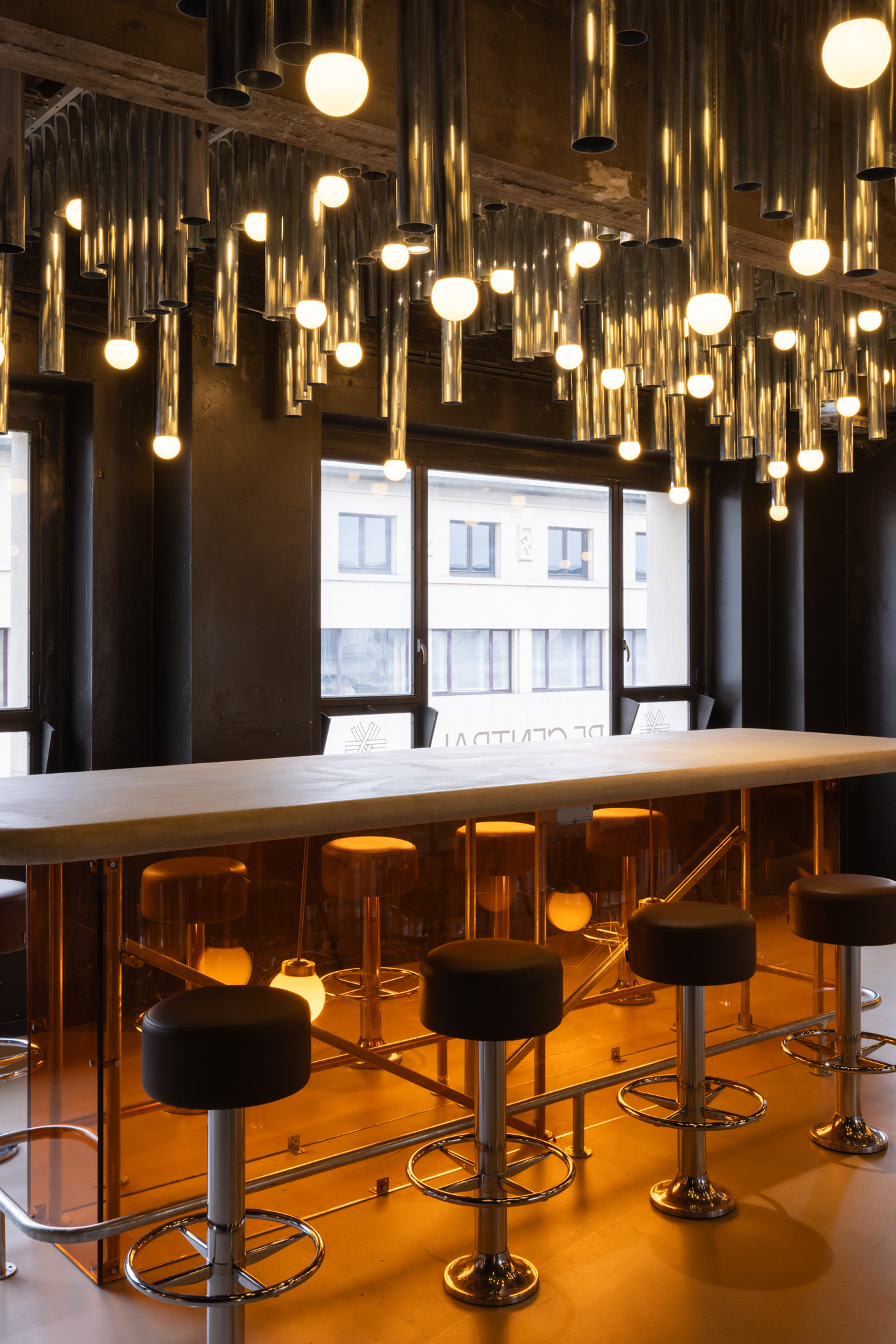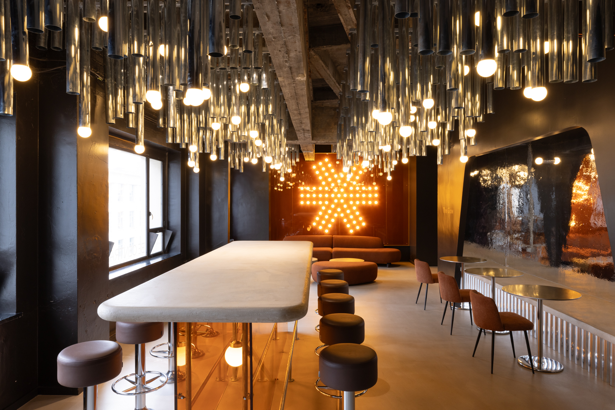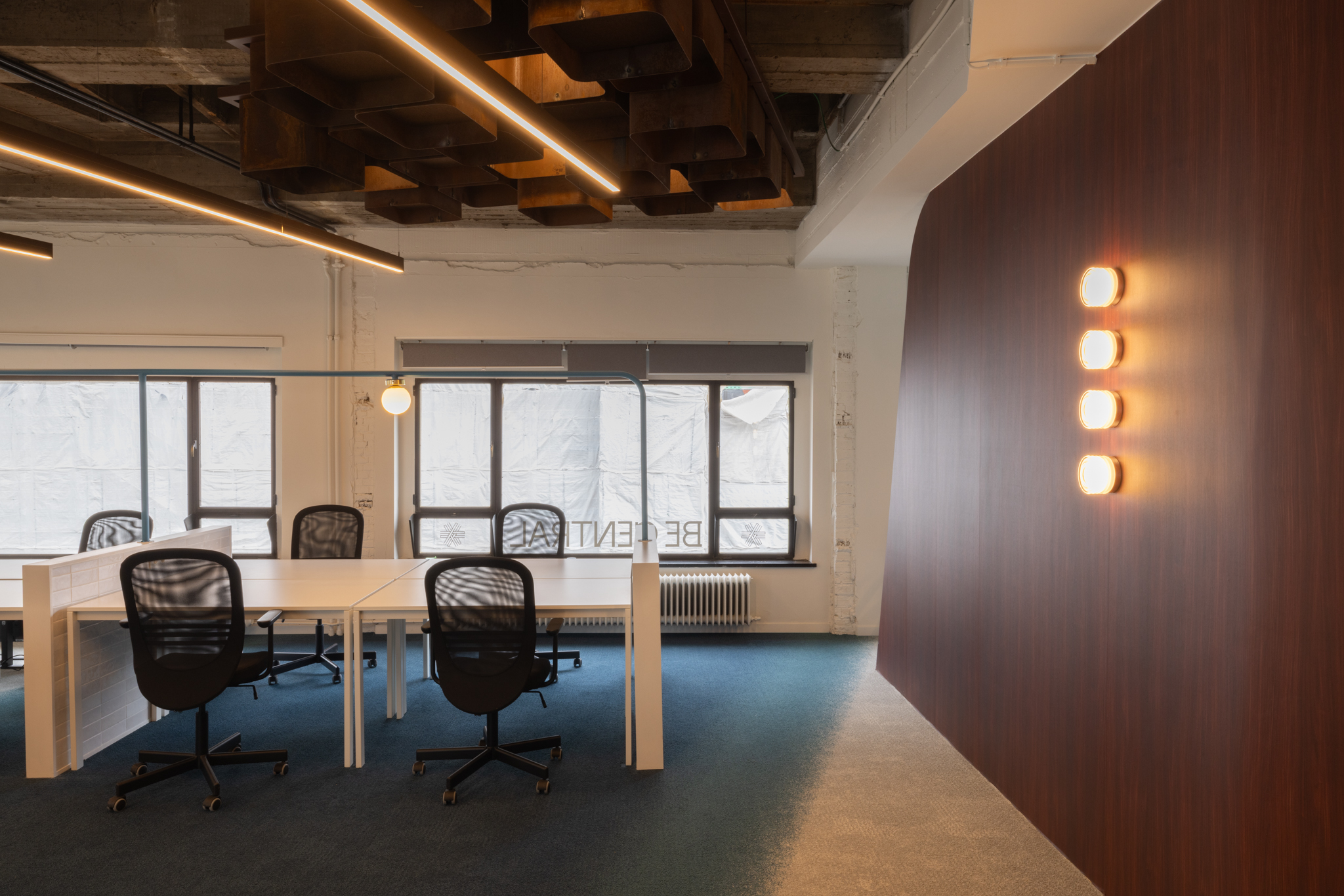 La zone collaborative Glow offre une expérience immersive sous un plafond constellé de tubes en zinc brillant. Cet assemblage audacieux oscille entre la fantasmagorie d’une grotte aux stalactites et l’ambiance d’un club rétro. Ce détournement créatif des matériaux de construction est l’une des signatures du studio Maxime de Campenaere, qui insuffle une nouvelle vie aux éléments industriels en leur conférant une esthétique inattendue. L’identité de BeCentral s’intègre harmonieusement dans le design intérieur grâce à une installation lumineuse composée de dizaines d’ampoules, matérialisant subtilement son logo.