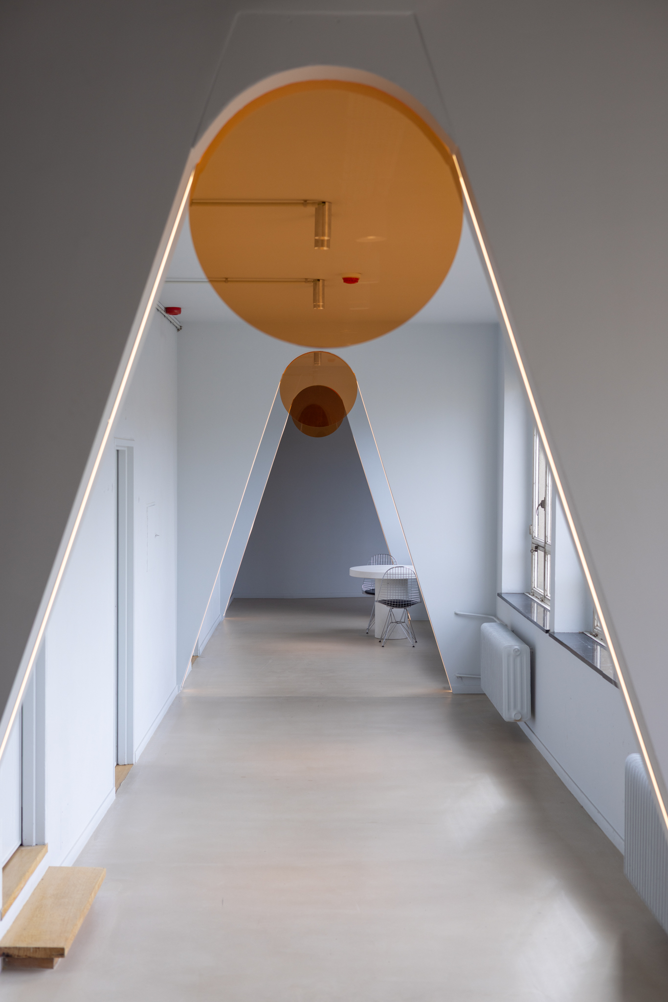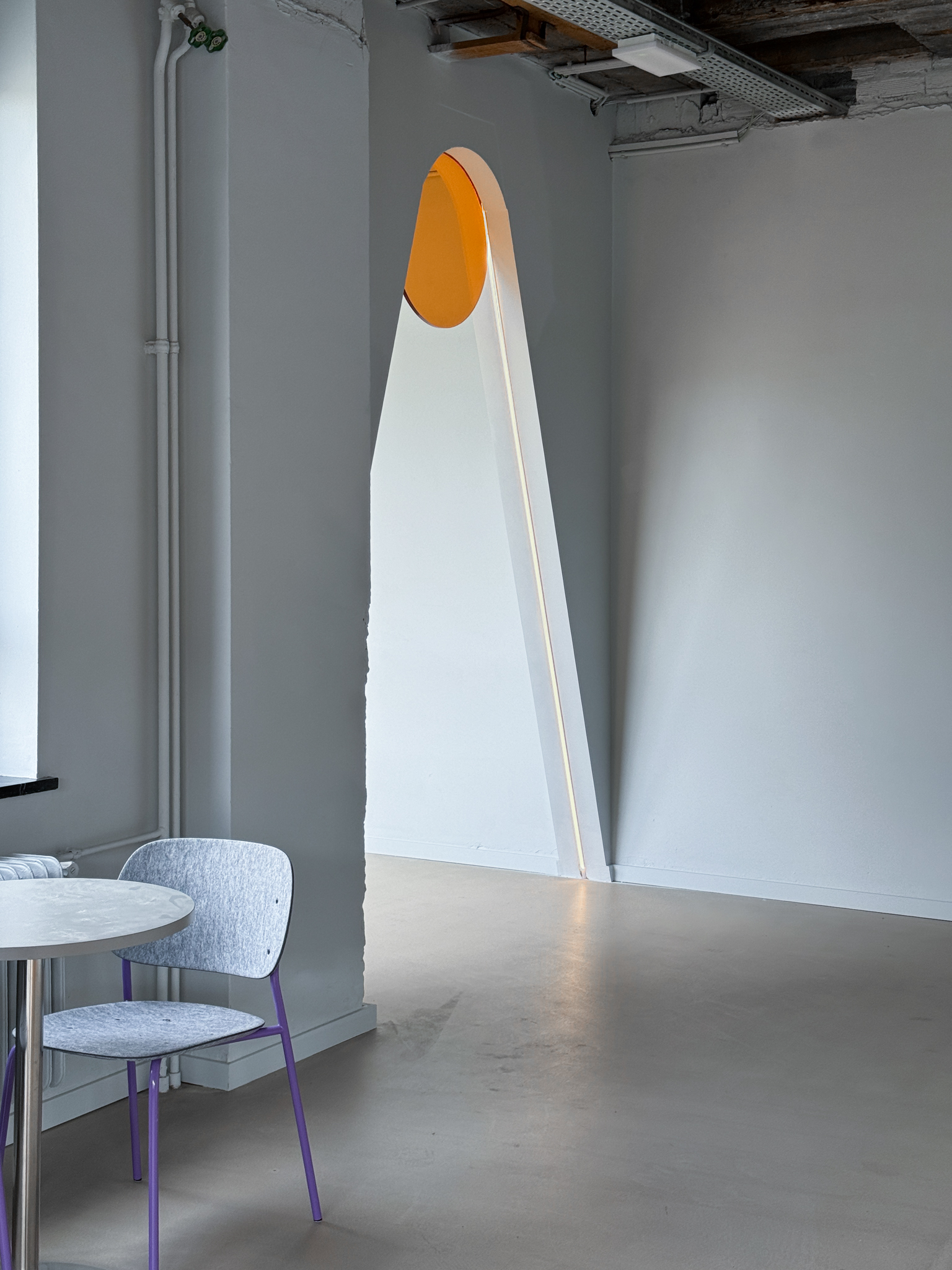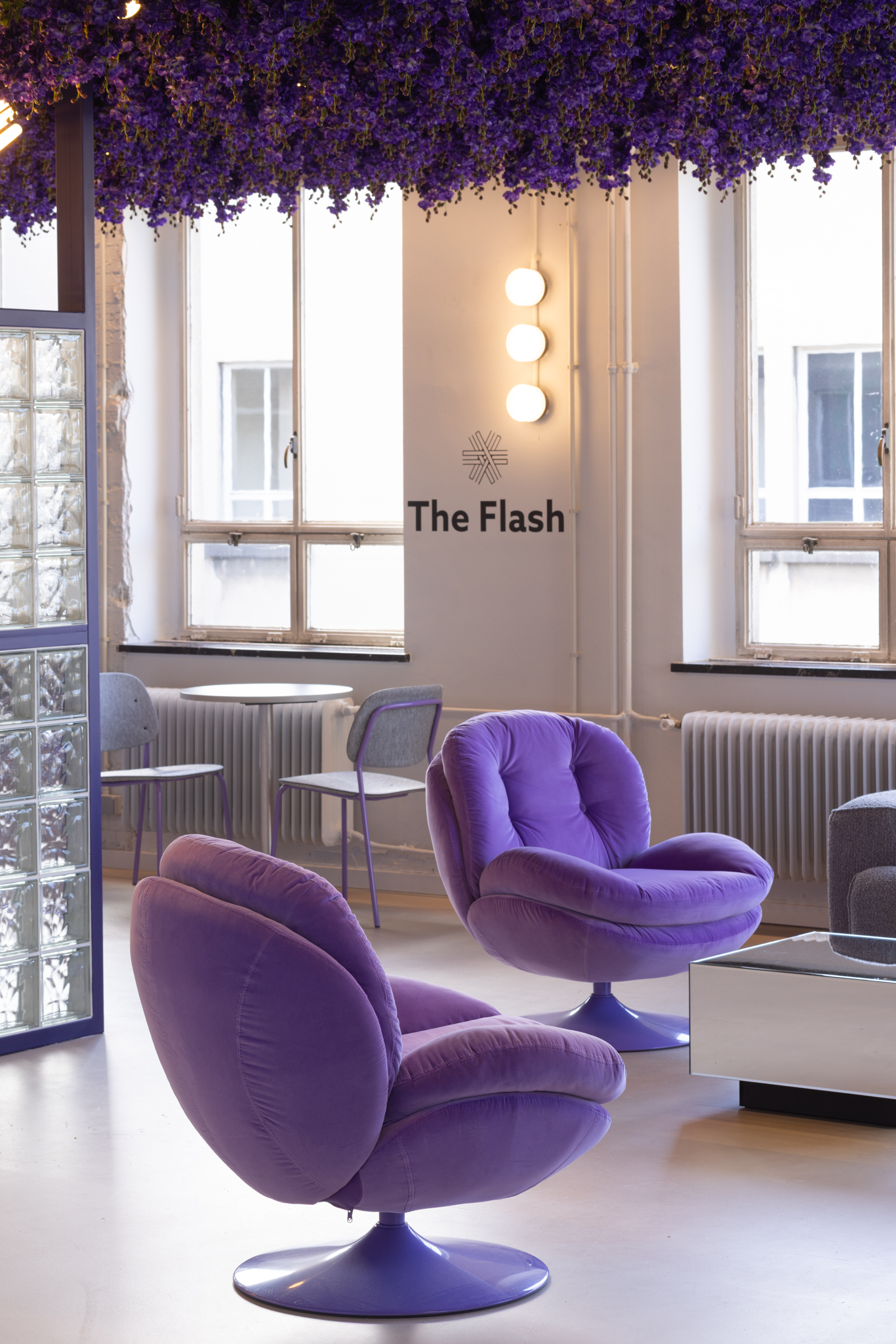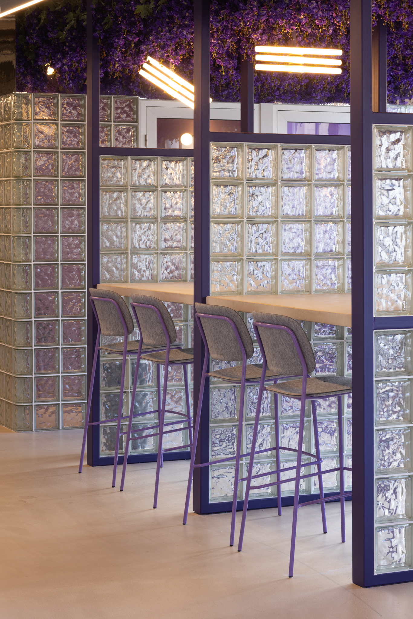 Dans l’espace Chill Field, la lumière naturelle est amplifiée par l’utilisation de briques de verre, tandis qu’un plafond orné de fleurs violettes renverse les perspectives, suggérant un monde à l’envers où tout devient possible. Une métaphore parfaite de l’univers des start-ups, où l’innovation naît souvent des idées les plus audacieuses.