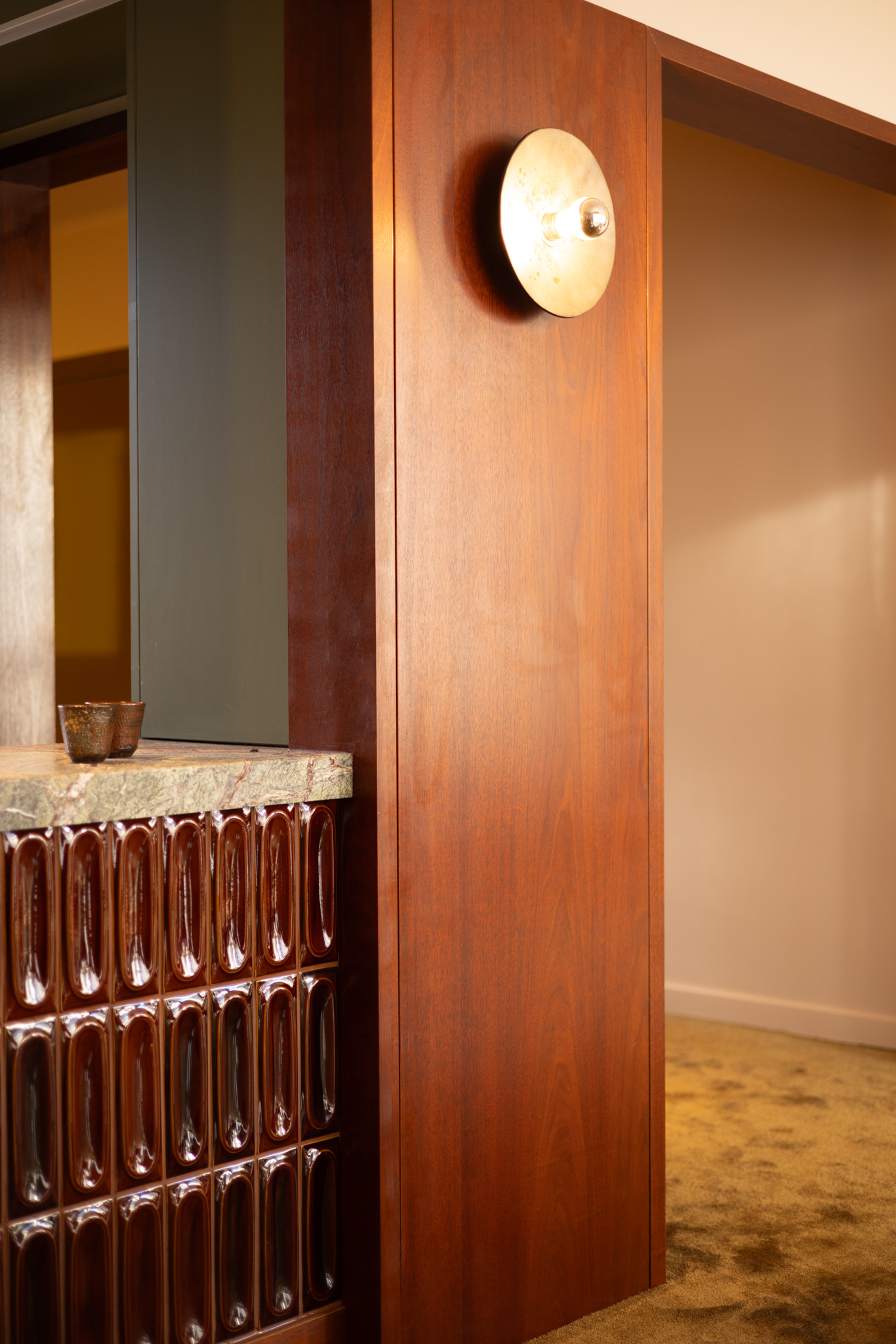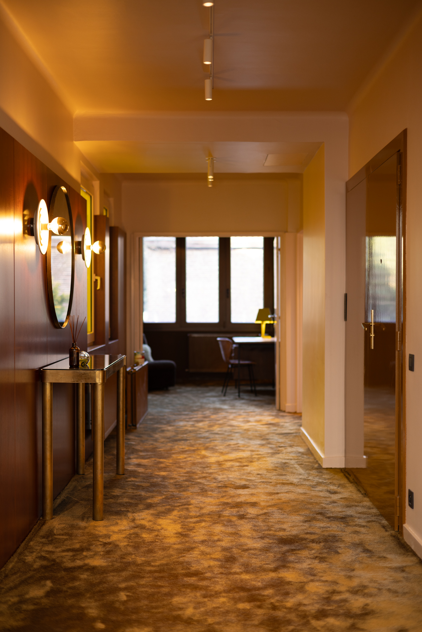 Chaque détail d’origine a été préservé et magnifié à travers un jeu subtil de textures et de matériaux riches : moquettes soyeuses, céramiques en relief audacieux, lambris en acajou de Honduras, et une palette de teintes feutrées. L’harmonie parfaite entre ancien et contemporain crée une fluidité visuelle où le temps semble suspendu.