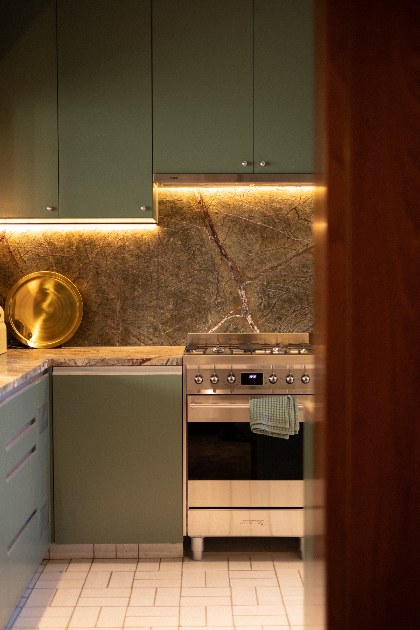 Le Studio Maxime de Campenaere a donné une seconde vie à la cuisine d’origine en rénovant et en sublimant son mobilier existant. Le plan de travail en marbre Forest Green, aux veinures profondes, apporte à la pièce une élégance naturelle et une profondeur luxueuse. Le passe-plat en bois noble, pensé comme un élément de transition, relie la cuisine à la salle à manger avec une mise en scène presque théâtralisée.