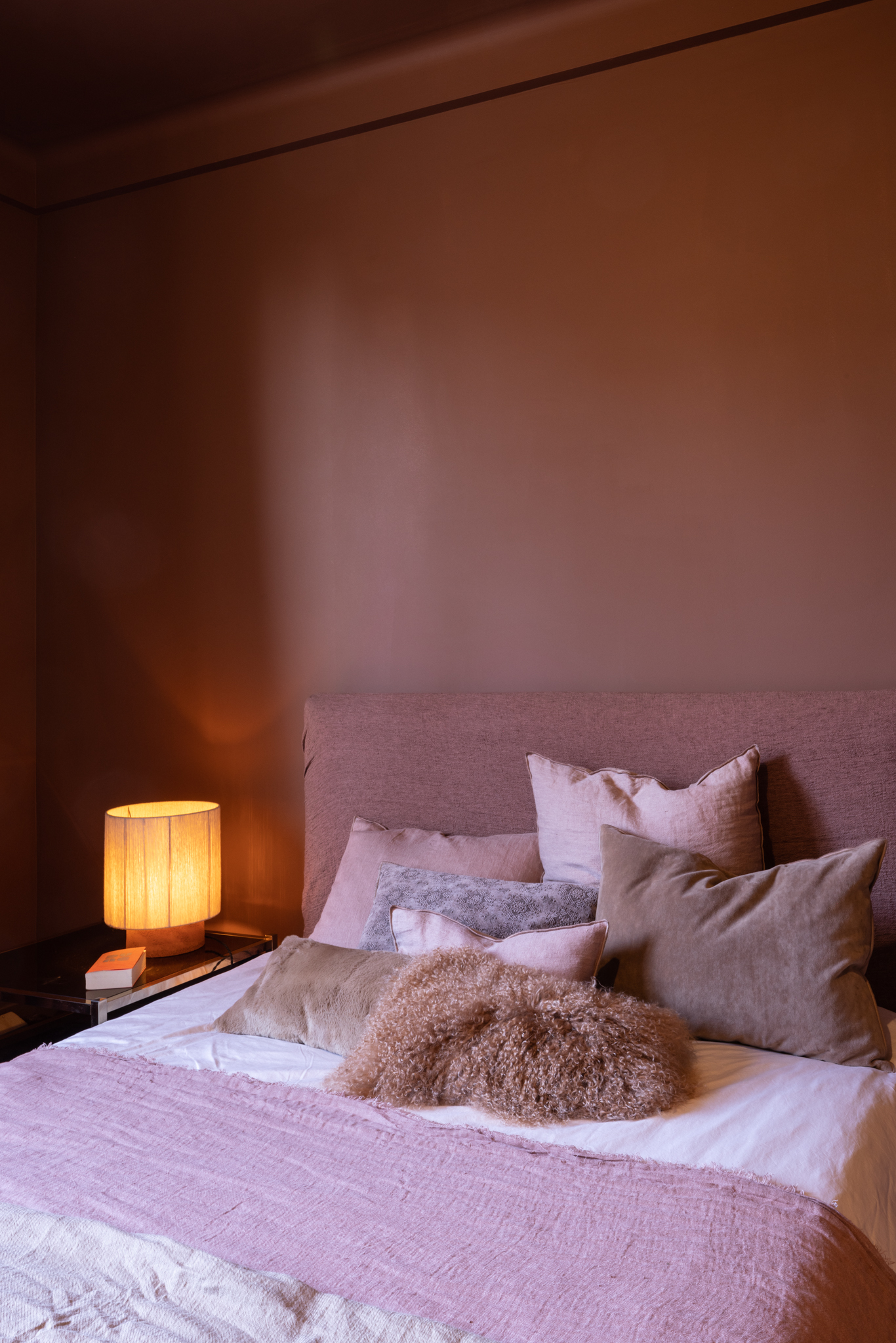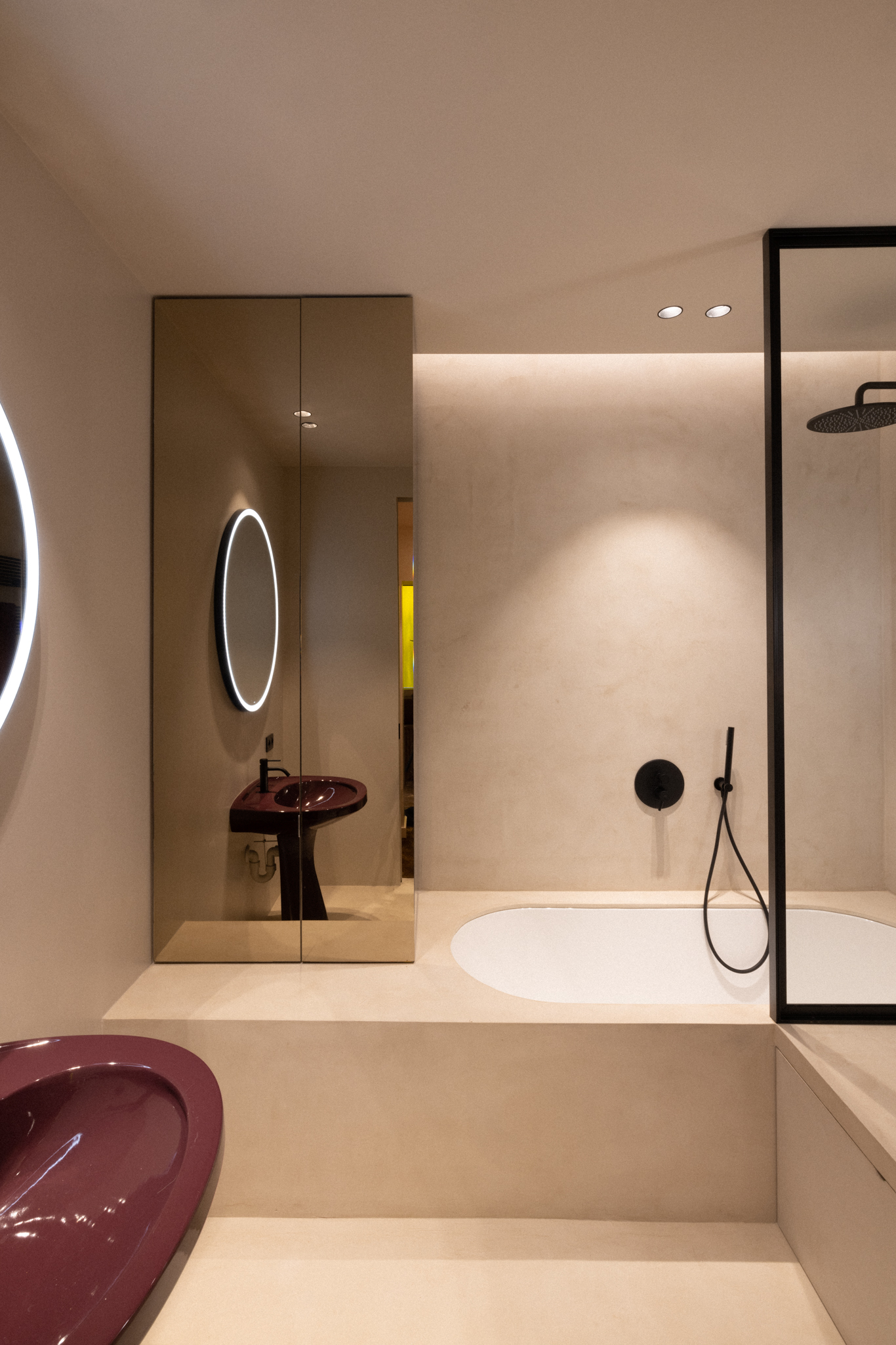 La salle de bain a été entièrement repensée et habillée d’enduits aux nuances naturelles, évoquant la douceur de la peau. Son élément phare – un lavabo vintage violet, pièce maîtresse qui ajoute une touche unique et audacieuse.