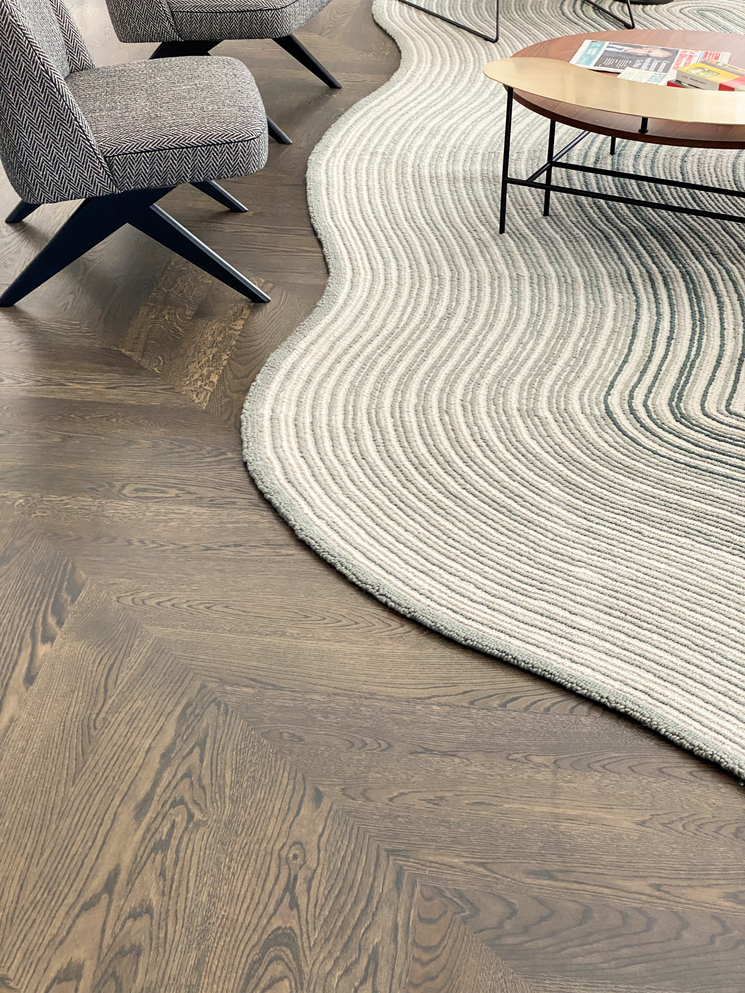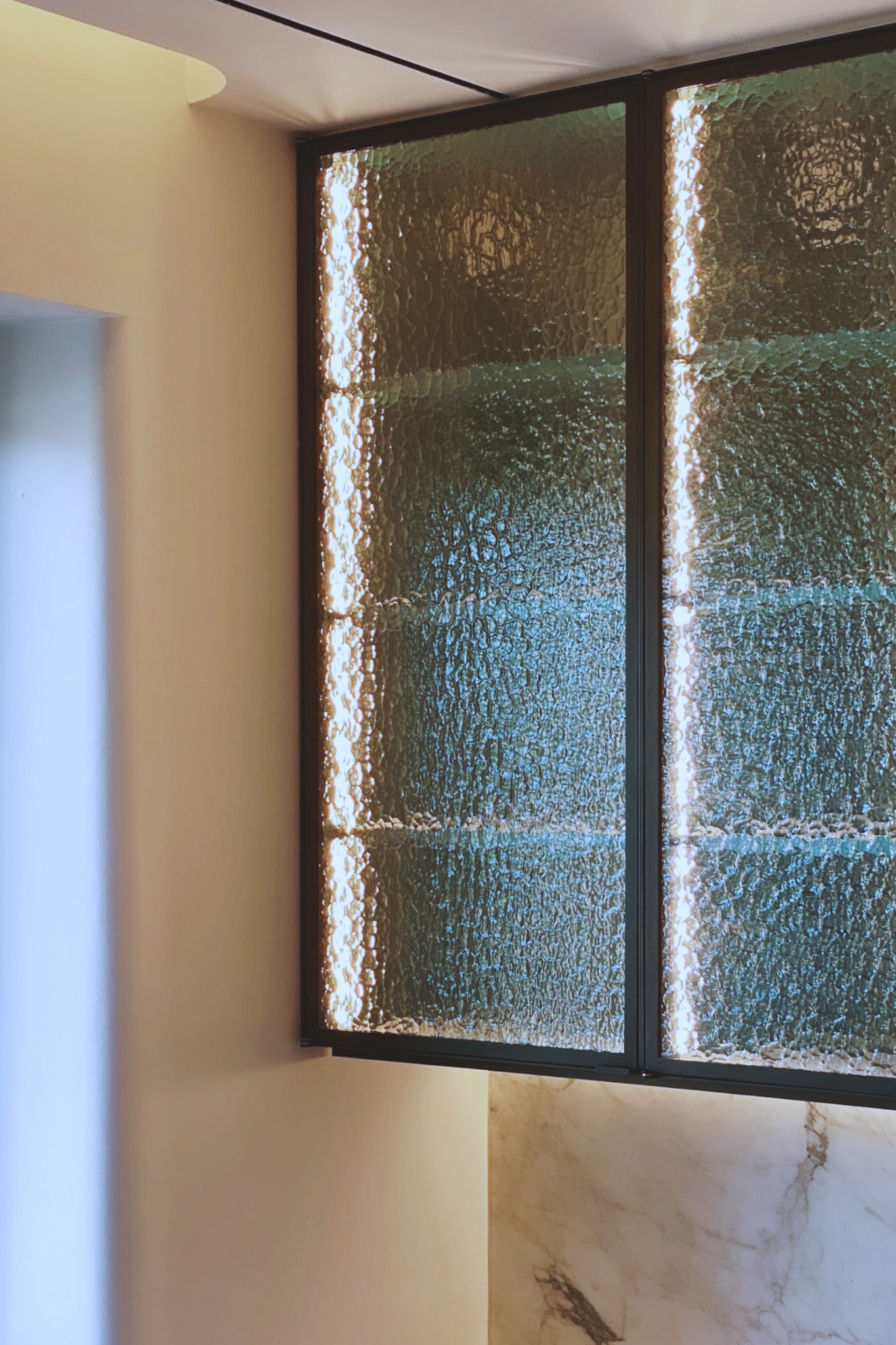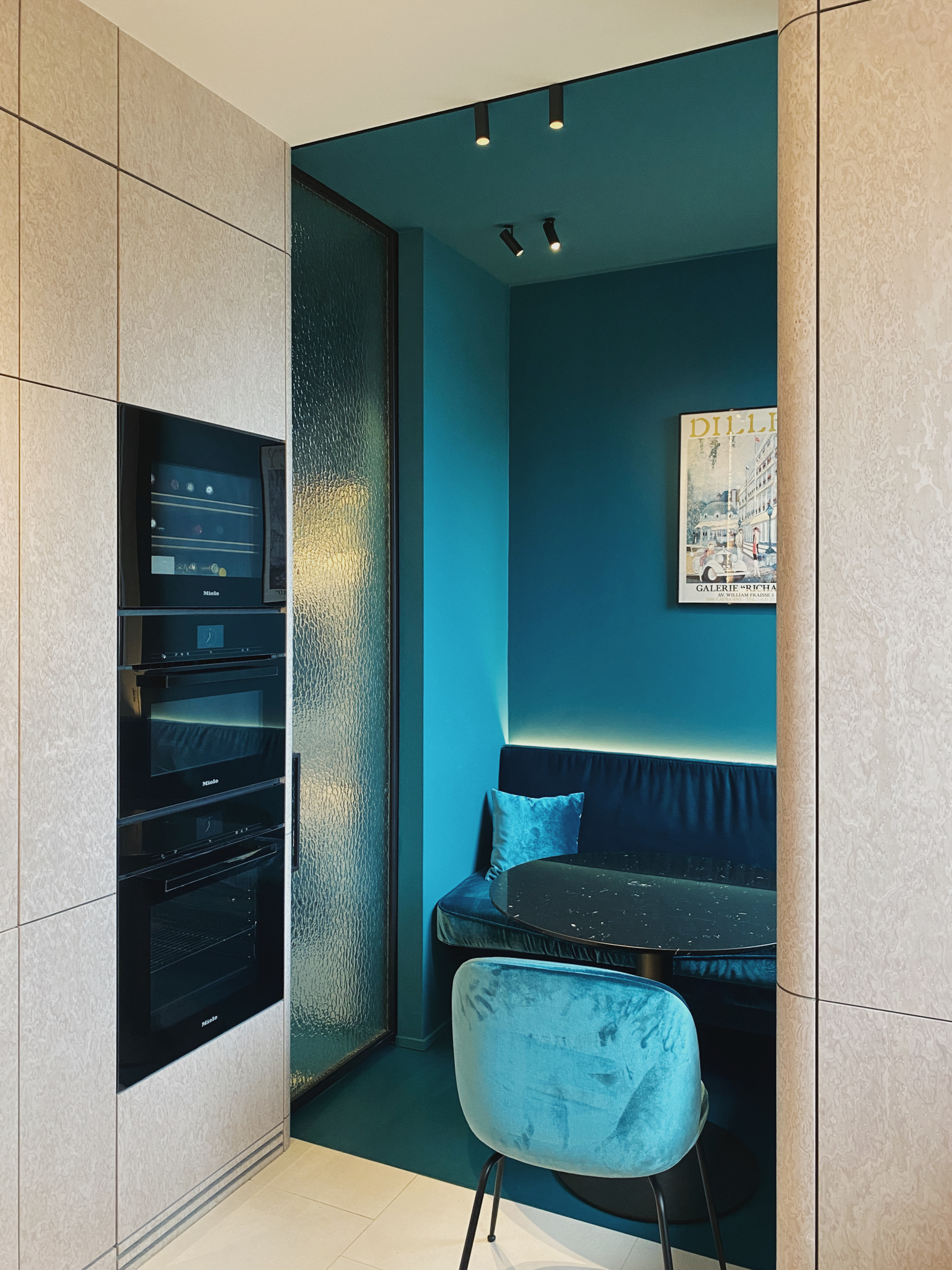 Cet appartement trois chambres, repensé autour d’un hall central circulaire, joue avec la dissolution des formes et l’intégration d’éléments organiques. L’eau se traduit dans l’espace par des détails en verre océanique, des teintes vert d’eau saturées et un tapis sur mesure en forme de flaque, subtilement reflété par le volume du plafond. La nature s’invite aussi à travers des textures et des jeux de lumière qui évoluent au fil de la journée, créant une atmosphère apaisante et immersive.