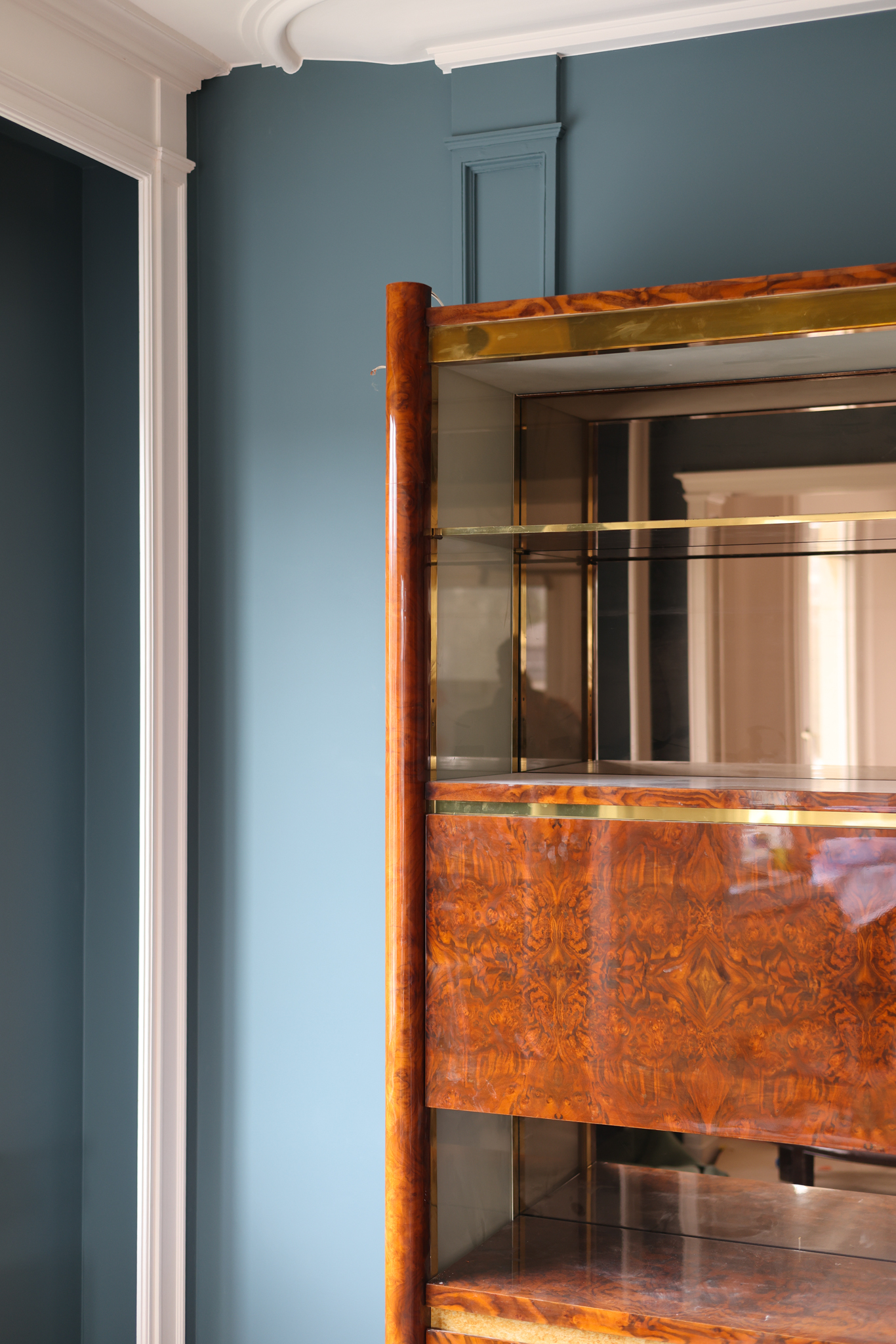 Les éléments de menuiserie sur mesure adoptent des lignes douces et des finitions arrondies, tandis que le placage en loupe d’érable clair évoque les empreintes laissées par la marée sur le sable. Chaque matériau raconte une histoire, entre textures organiques et finitions sophistiquées. L’équilibre subtil entre la délicatesse du bois et la profondeur des teintes naturelles accentue le caractère unique de l’ensemble.