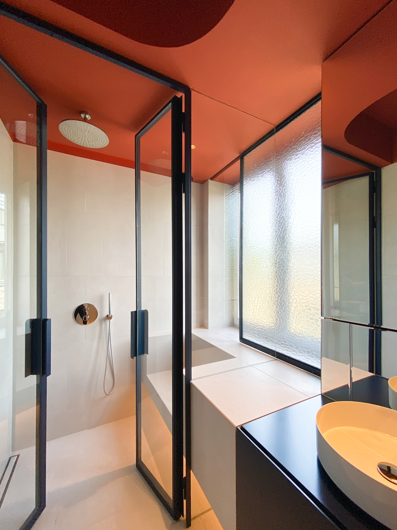 La réduction des accès au hall central a permis d’optimiser l’apport de lumière naturelle, créant des perspectives traversantes et une circulation plus fluide. Des solutions créatives ont été mises en place afin de permettre à la luminosité de pénétrer jusqu’aux salles d’eau, renforçant la sensation d’espace et de clarté. Le travail sur la transparence et les jeux de réflexion amplifie cette impression, transformant chaque pièce en un écrin baigné de lumière.