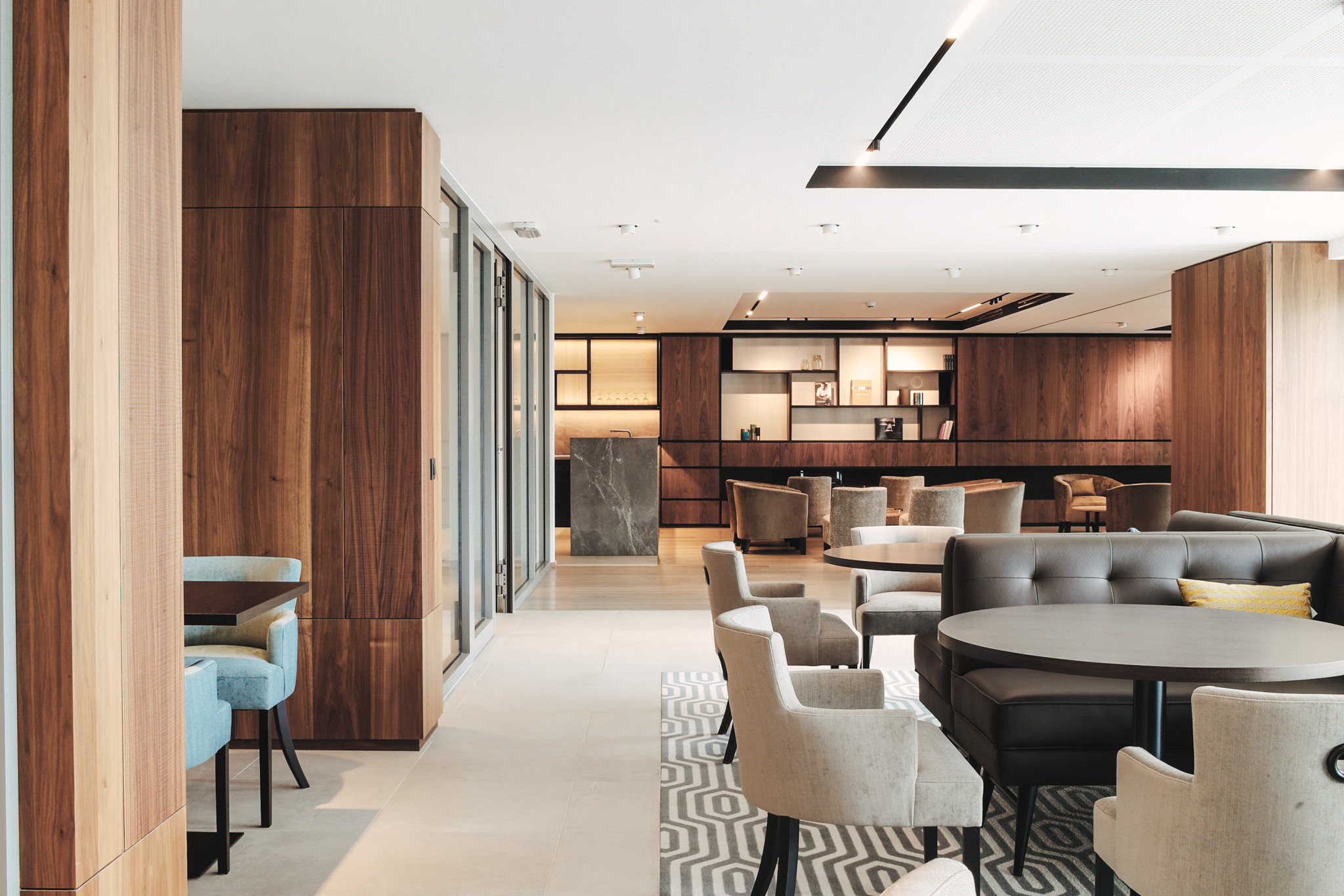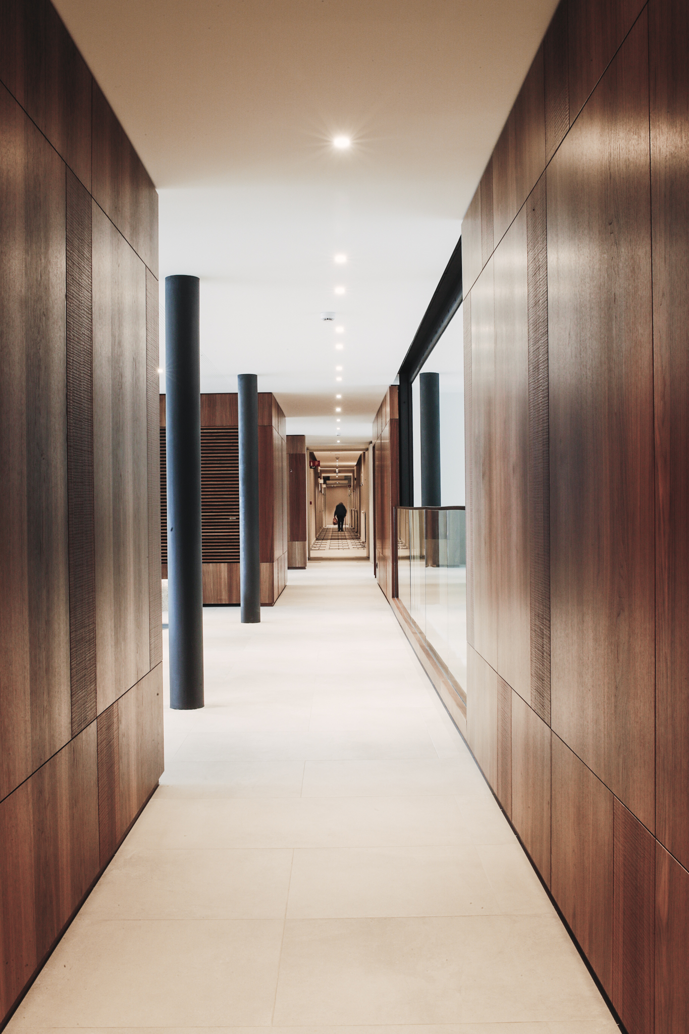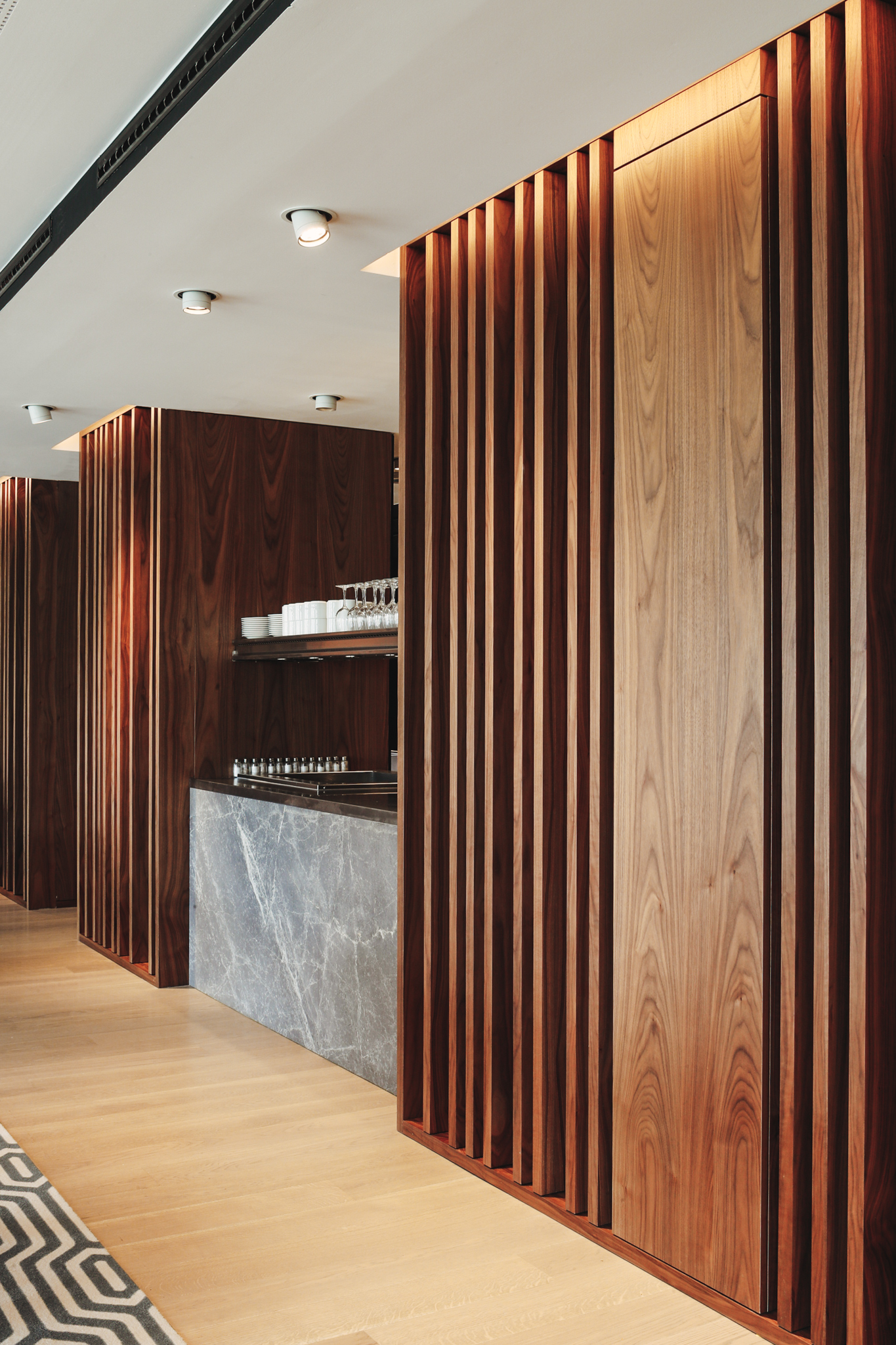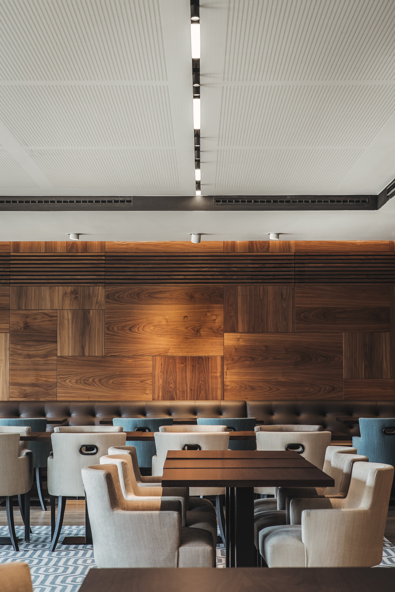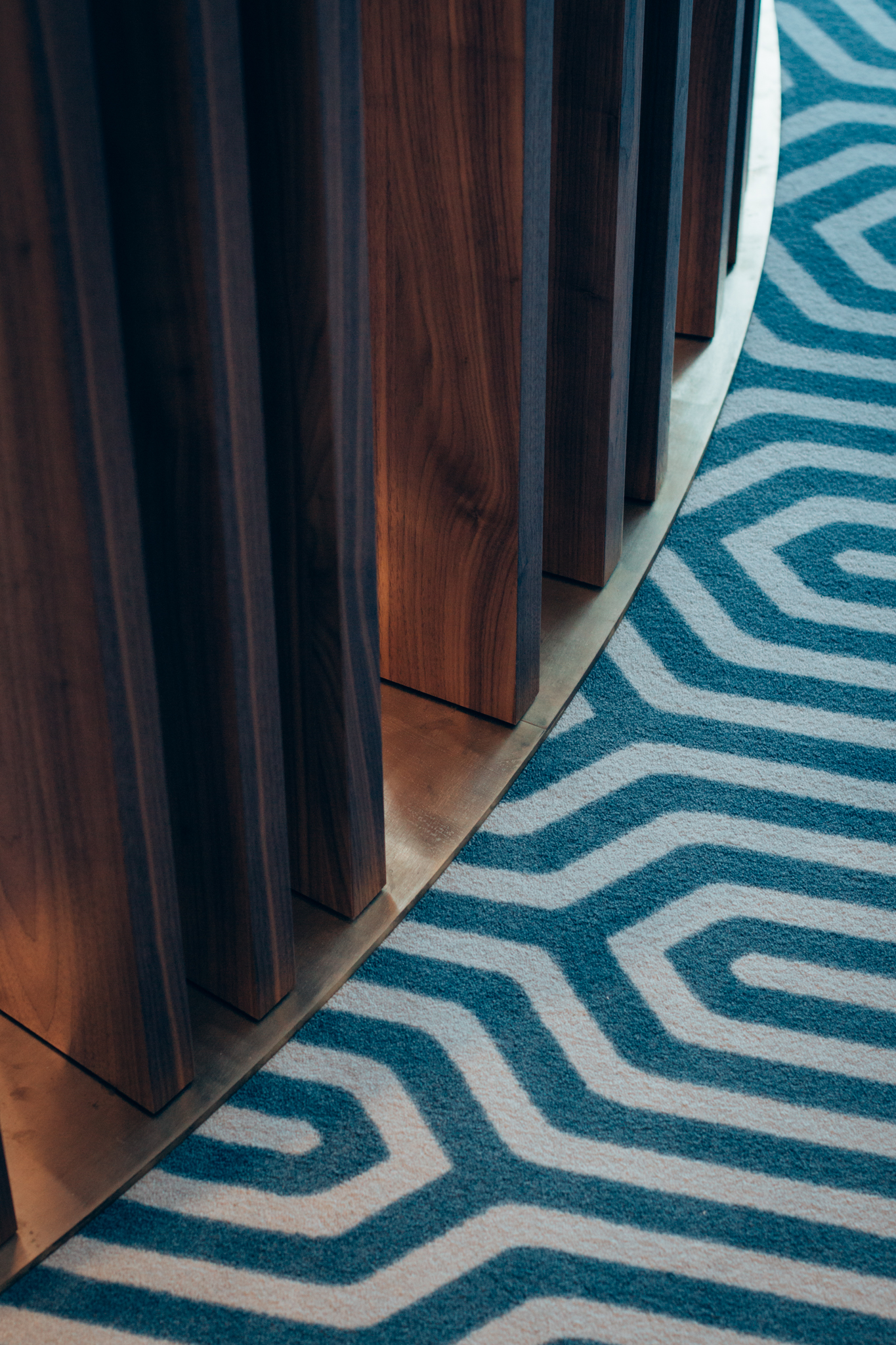 L’architecture intérieure repose sur une approche contemporaine et raffinée, où luxe et convivialité se conjuguent harmonieusement. Le Noyer d’Amérique est le fil conducteur du design, utilisé sur plus de 800 m² sous diverses finitions – lisse, brut de sciage – et décliné en claustras, lambris et mobilier. Chaque détail a été minutieusement étudié, notamment le jeu des joints entre les panneaux, pour une mise en rythme subtile et élégante.