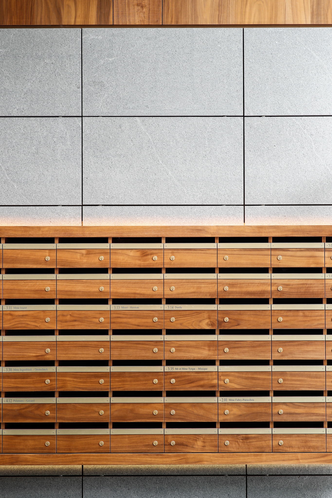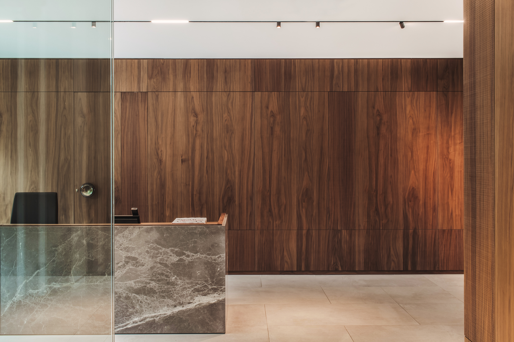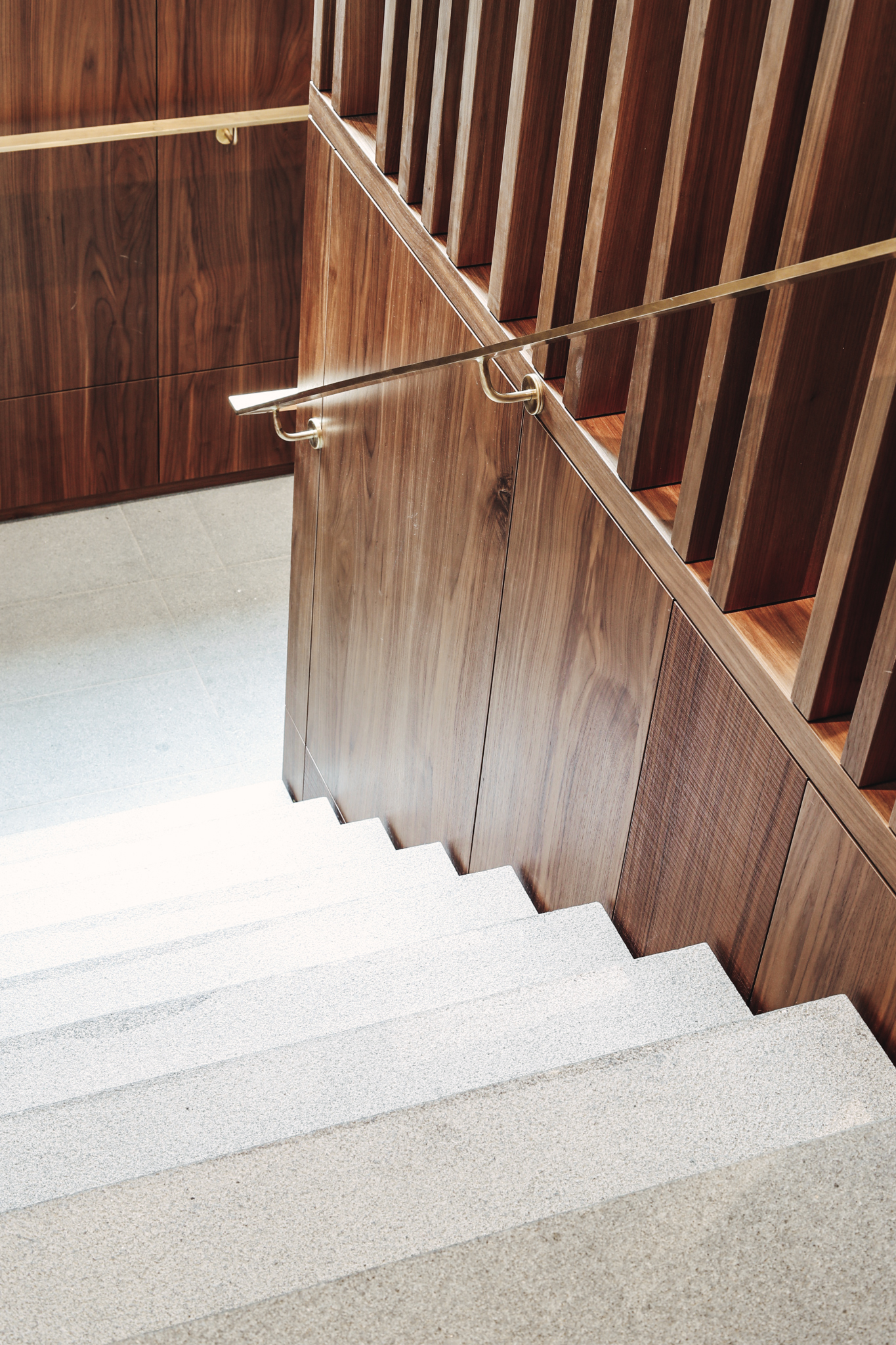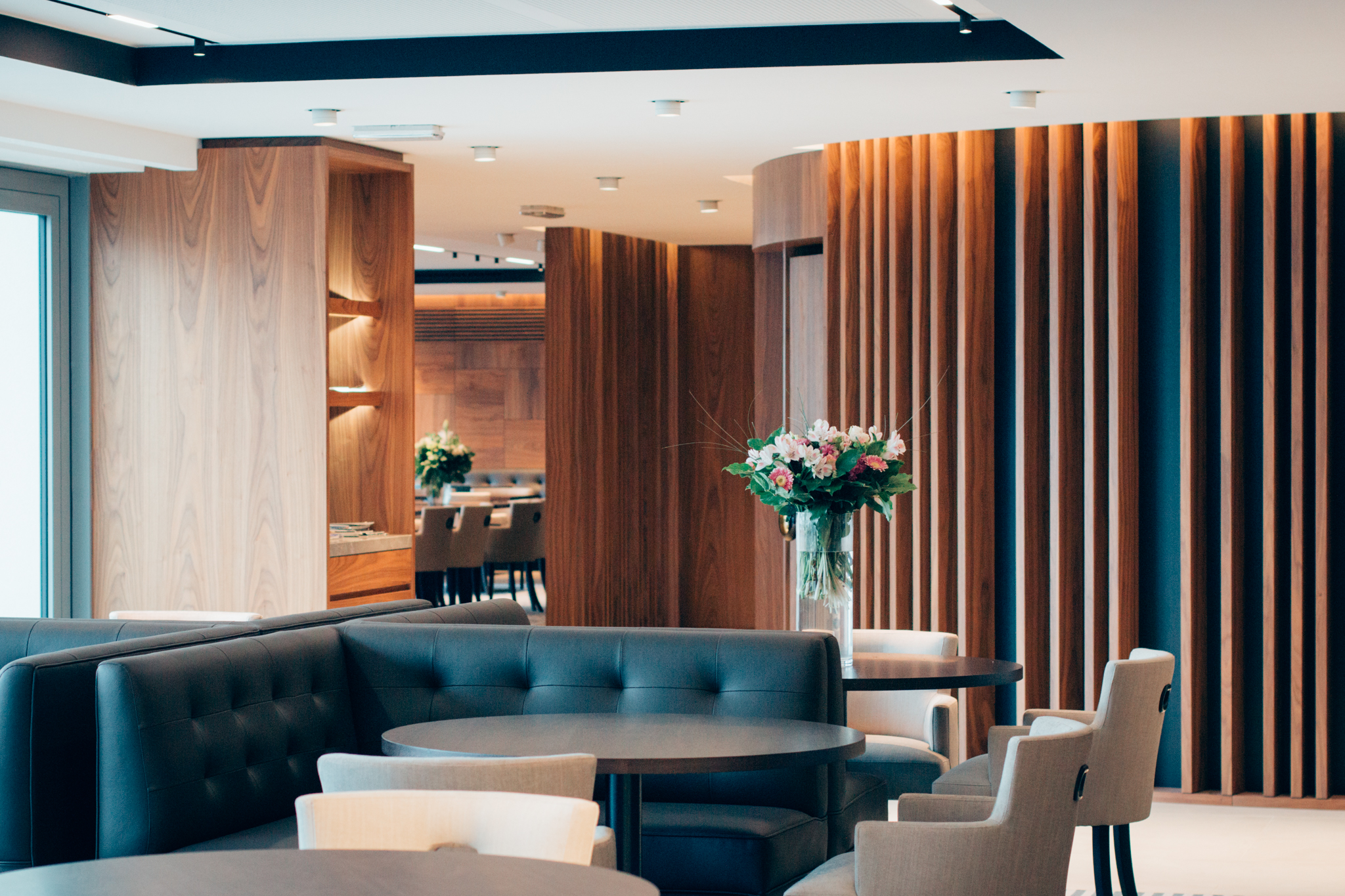 L’architecture intérieure repose sur une approche contemporaine et raffinée, où luxe et convivialité se conjuguent harmonieusement. Le Noyer d’Amérique est le fil conducteur du design, utilisé sur plus de 800 m² sous diverses finitions – lisse, brut de sciage – et décliné en claustras, lambris et mobilier. Chaque détail a été minutieusement étudié, notamment le jeu des joints entre les panneaux, pour une mise en rythme subtile et élégante.