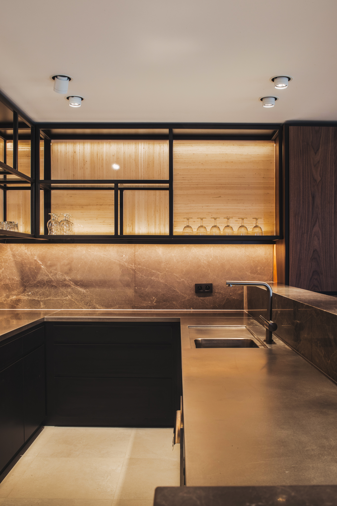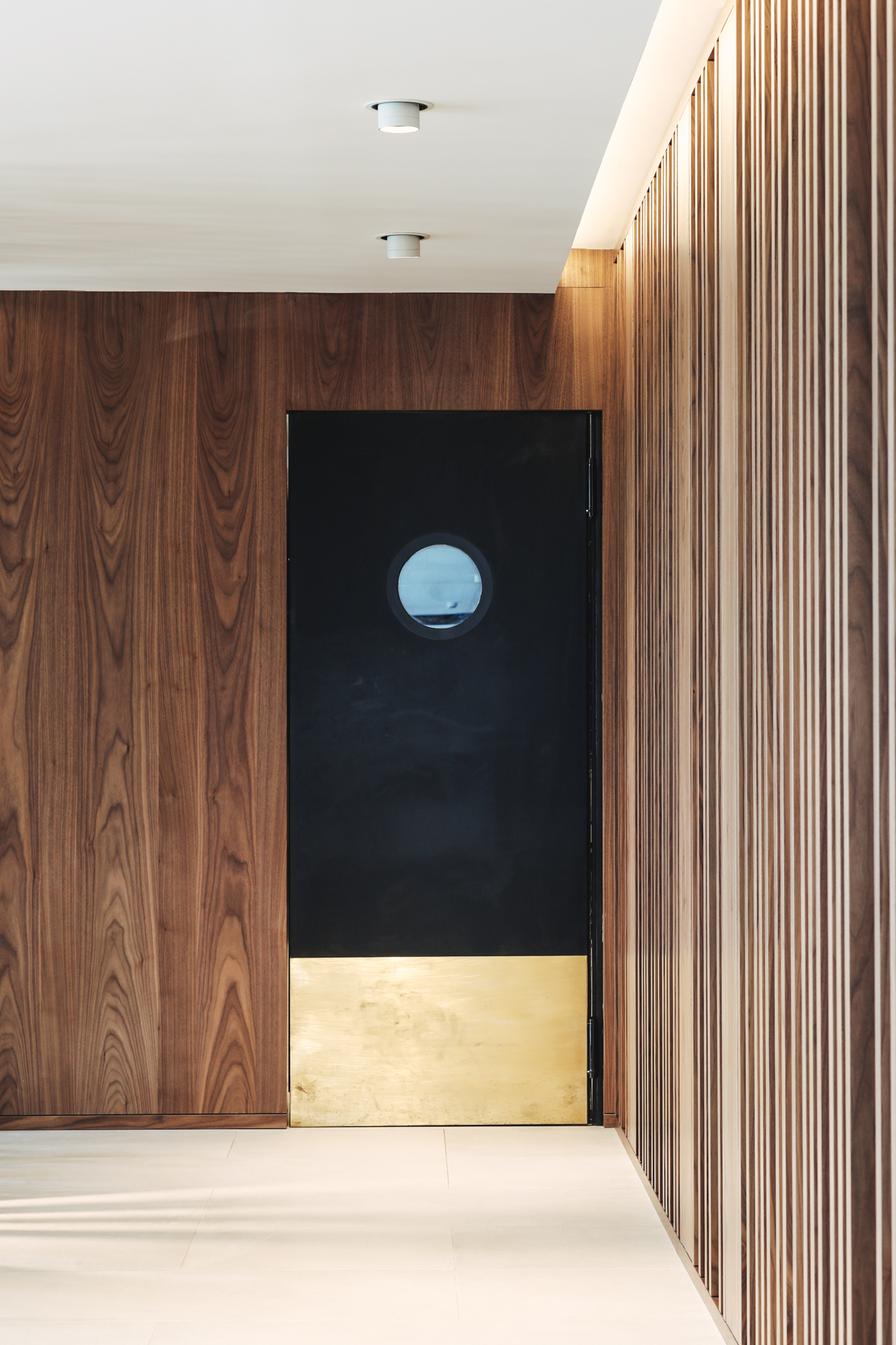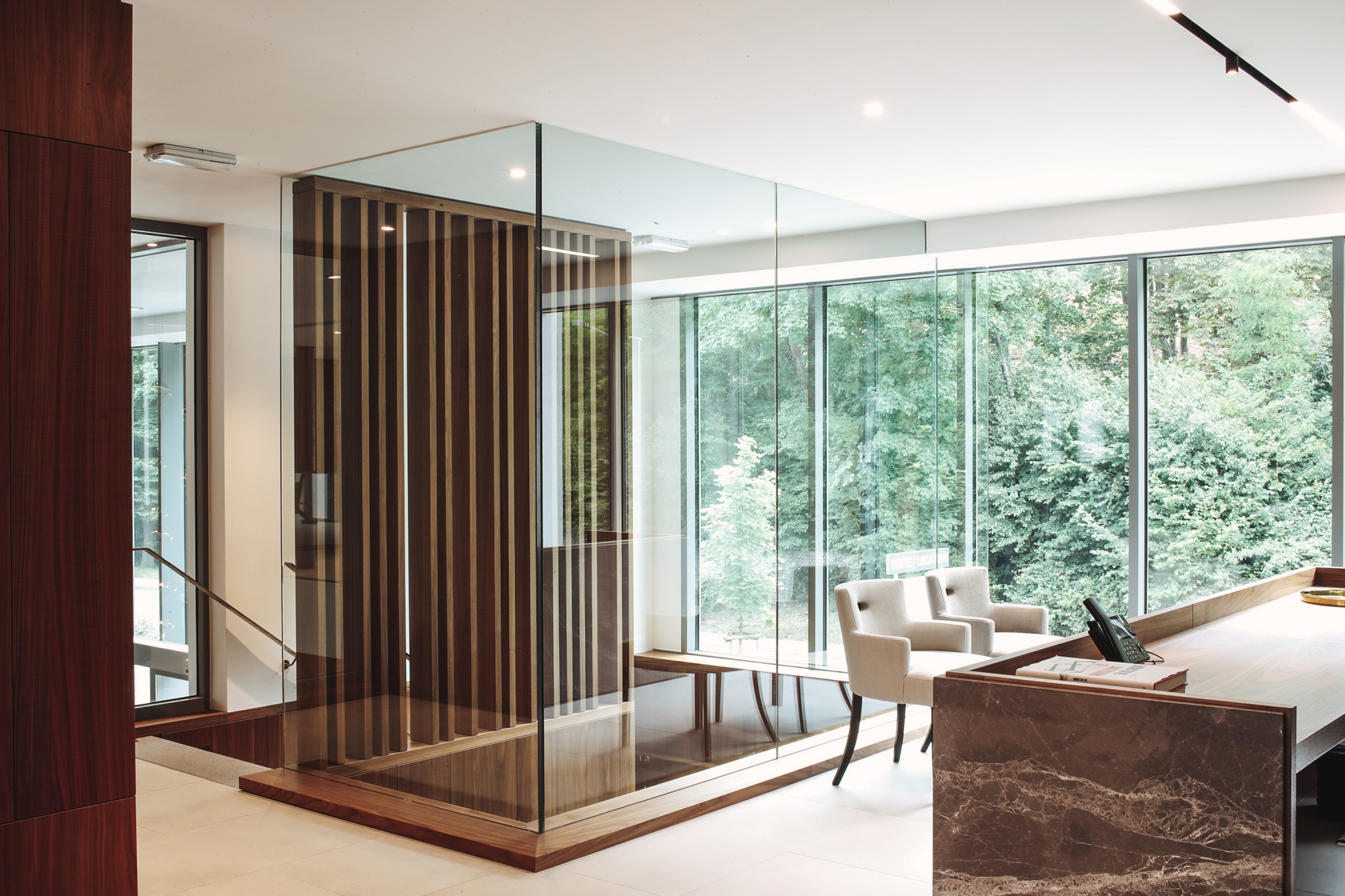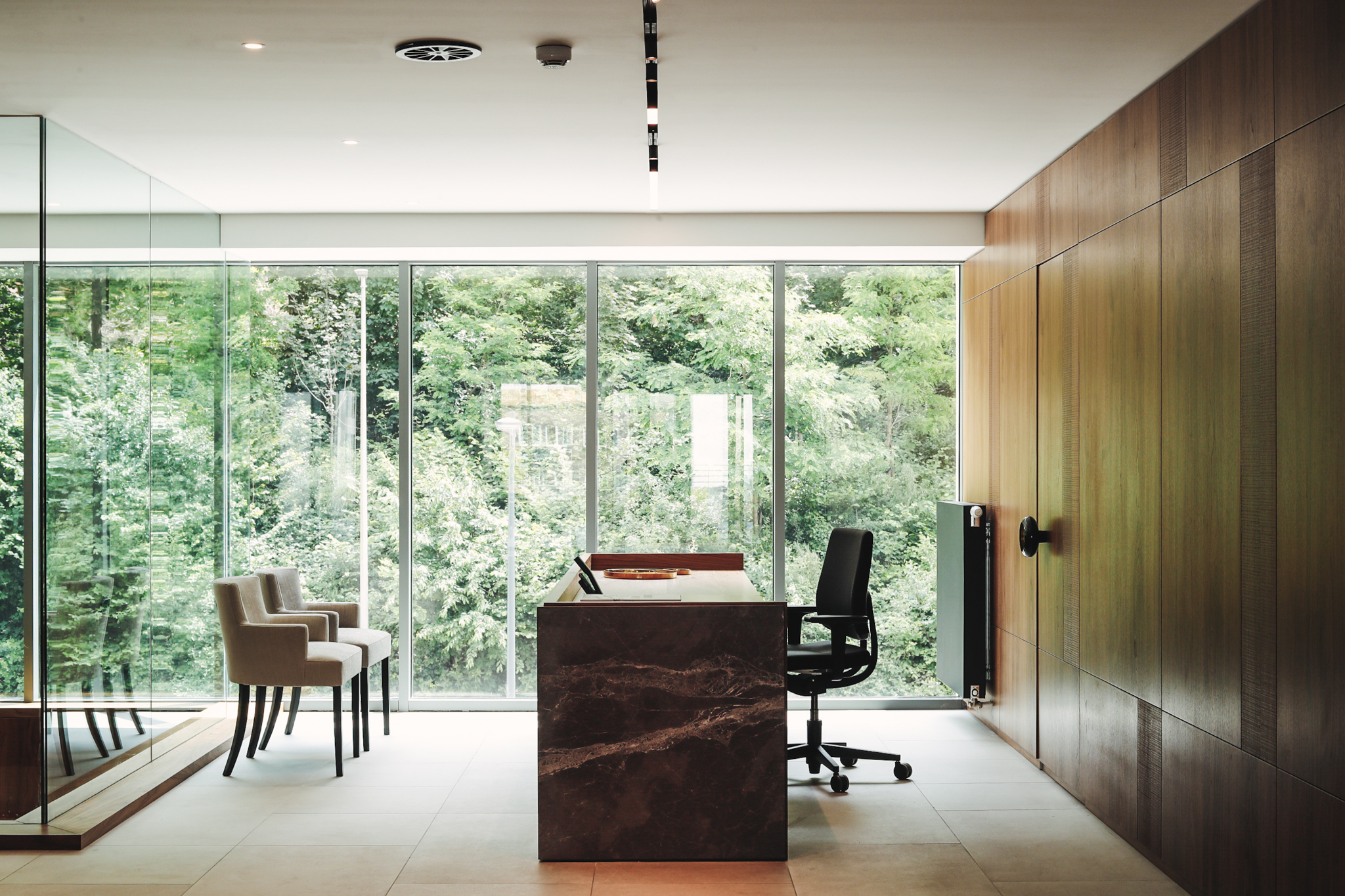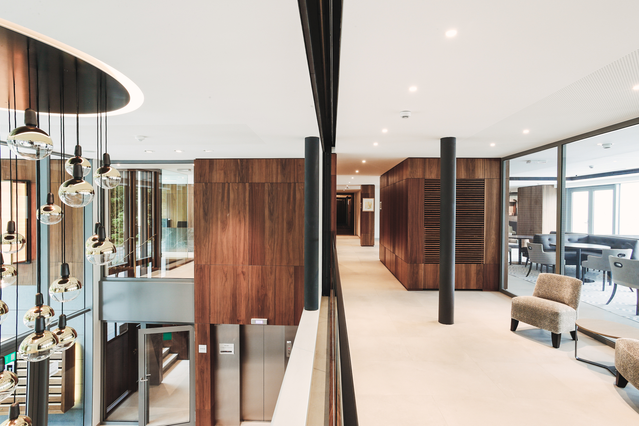 L’architecture intérieure repose sur une approche contemporaine et raffinée, où luxe et convivialité se conjuguent harmonieusement. Le Noyer d’Amérique est le fil conducteur du design, utilisé sur plus de 800 m² sous diverses finitions – lisse, brut de sciage – et décliné en claustras, lambris et mobilier. Chaque détail a été minutieusement étudié, notamment le jeu des joints entre les panneaux, pour une mise en rythme subtile et élégante.