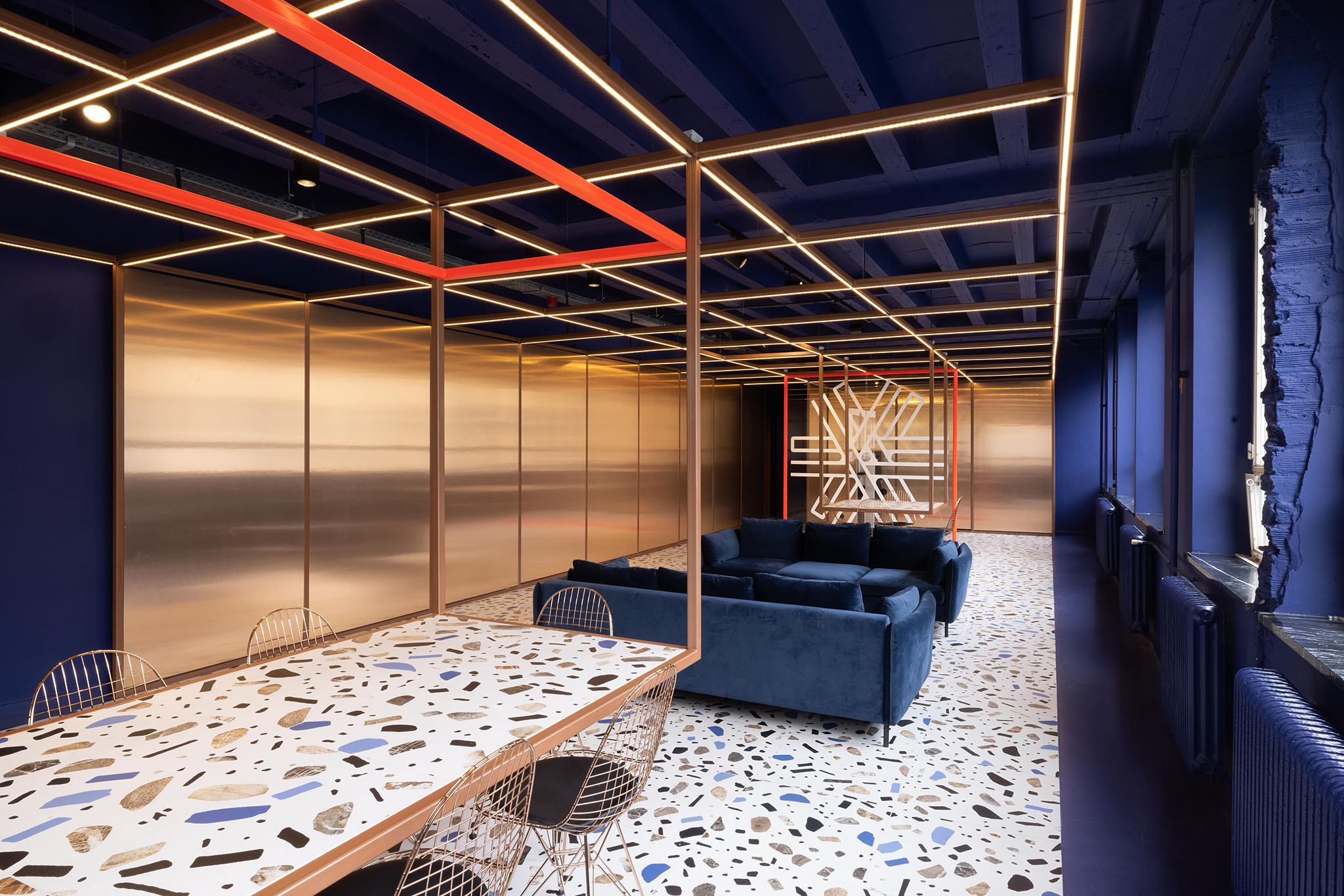 Notre mission était de concrétiser le rêve du client en imaginant des espaces de travail inspirants, dédiés aux jeunes entrepreneurs. Chaque zone a été pensée pour stimuler la créativité sans jamais devenir envahissante. Nous avons conçu un environnement où les esprits créatifs peuvent se sentir à la fois portés et apaisés. Pour cela, le studio a travaillé sur les perceptions sensorielles. Un horizon visuel a été créé grâce à une grille lumineuse reflétée dans des panneaux de verre et de cuivre, offrant une profondeur et une perspective uniques. Les tables, suspendues au plafond, accentuent la sensation de légèreté et de liberté. Cet agencement épuré, allié à ces interventions architecturales subtiles, donne naissance à un espace de travail positif, propice à l’innovation.